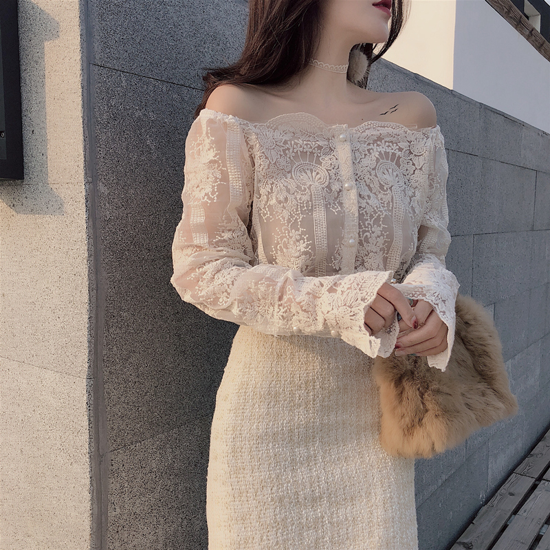 女神套裝新款襯衫蕾絲打底衫上衣+寬松顯瘦高腰絲絨半身裙女長裙