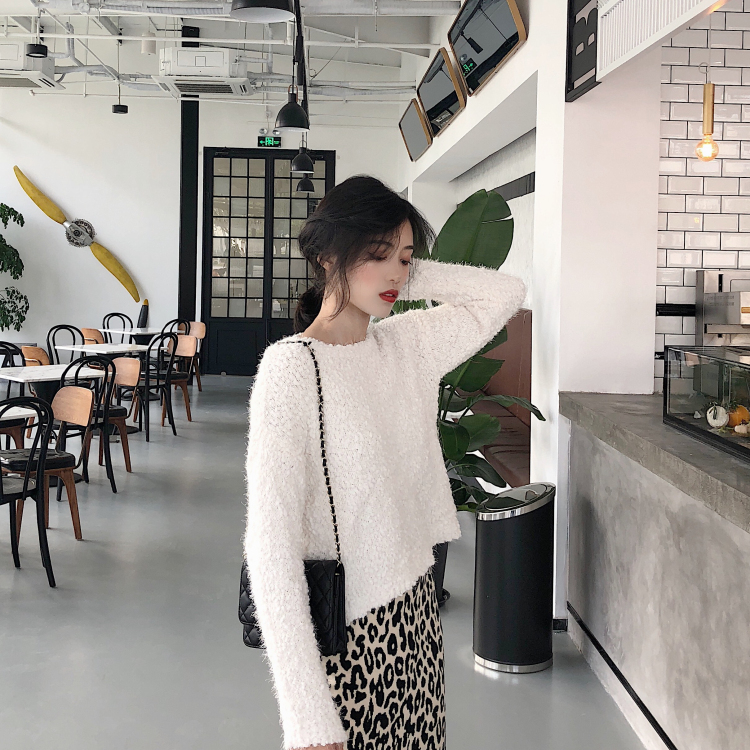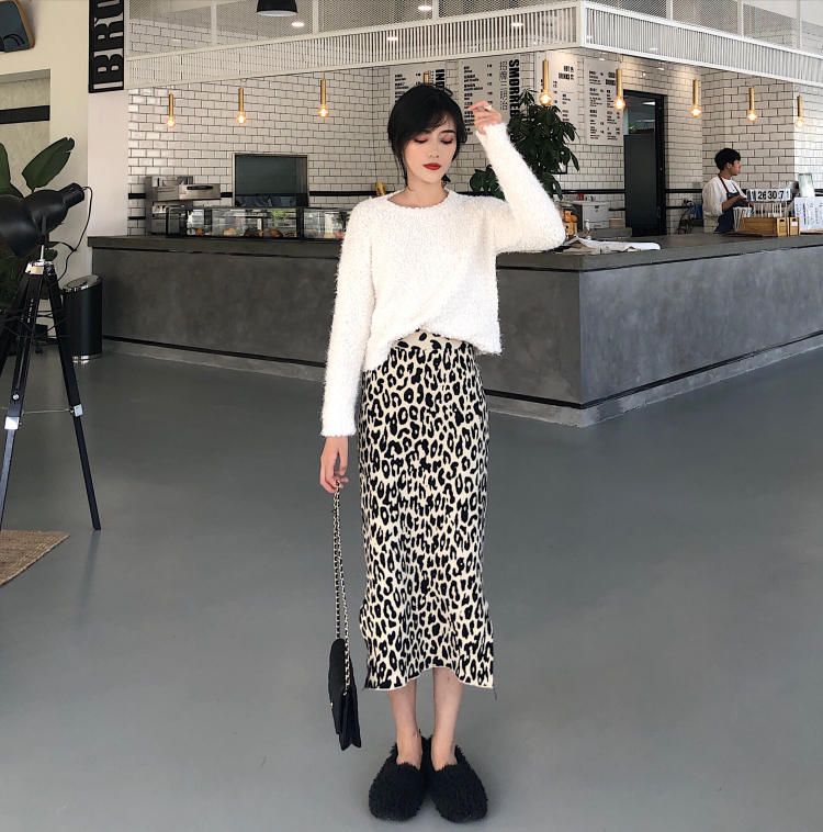 / 韓版純色顯瘦上衣毛絨絨寬松毛衣女針織衫 +豹紋包臂半身裙兩件套