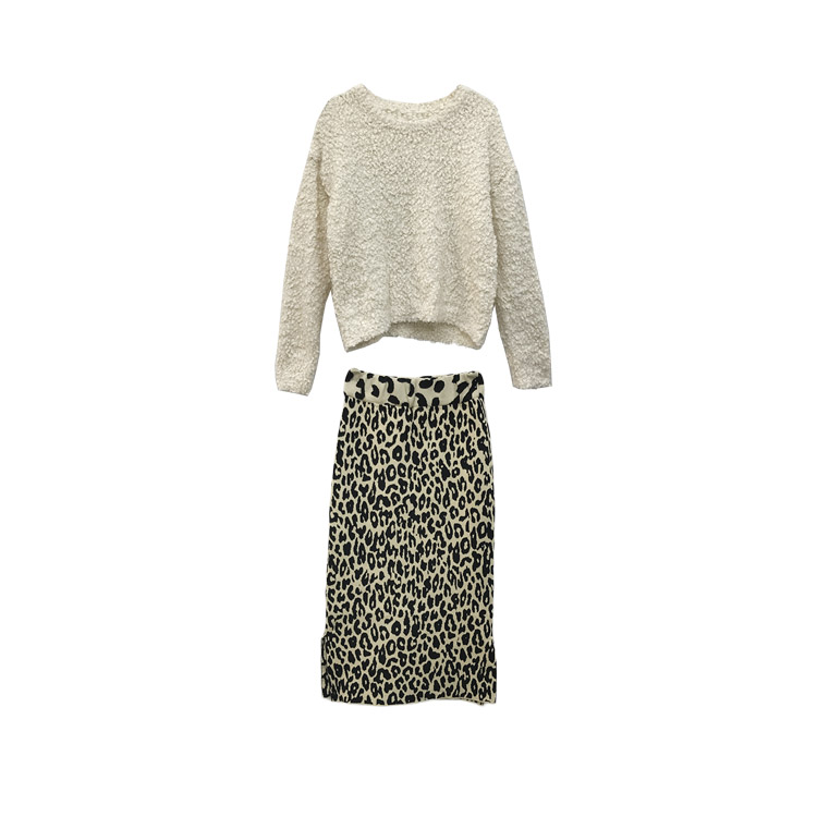 韓版純色顯瘦上衣毛絨絨寬松毛衣女針織衫 +豹紋包臂半身裙兩件套