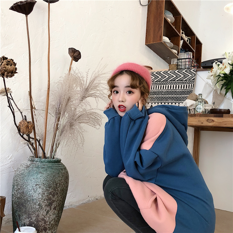 秋冬女裝韓版中長款慵懶風拼色寬松刺繡字母連帽套頭衛衣上衣外套