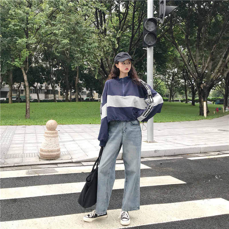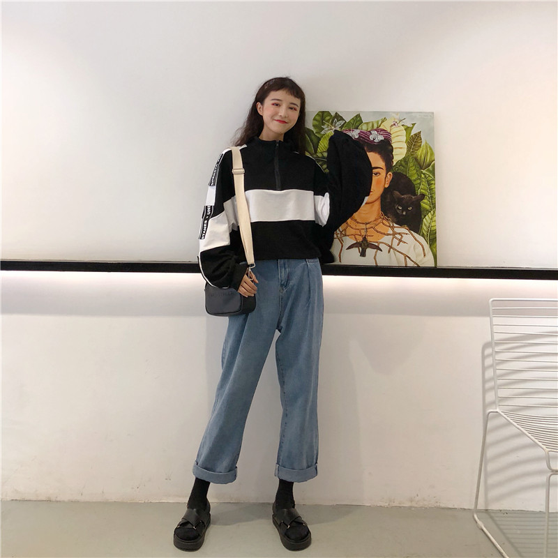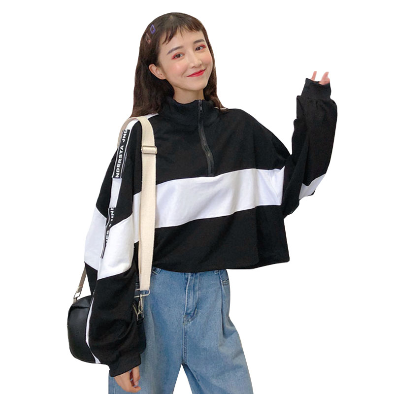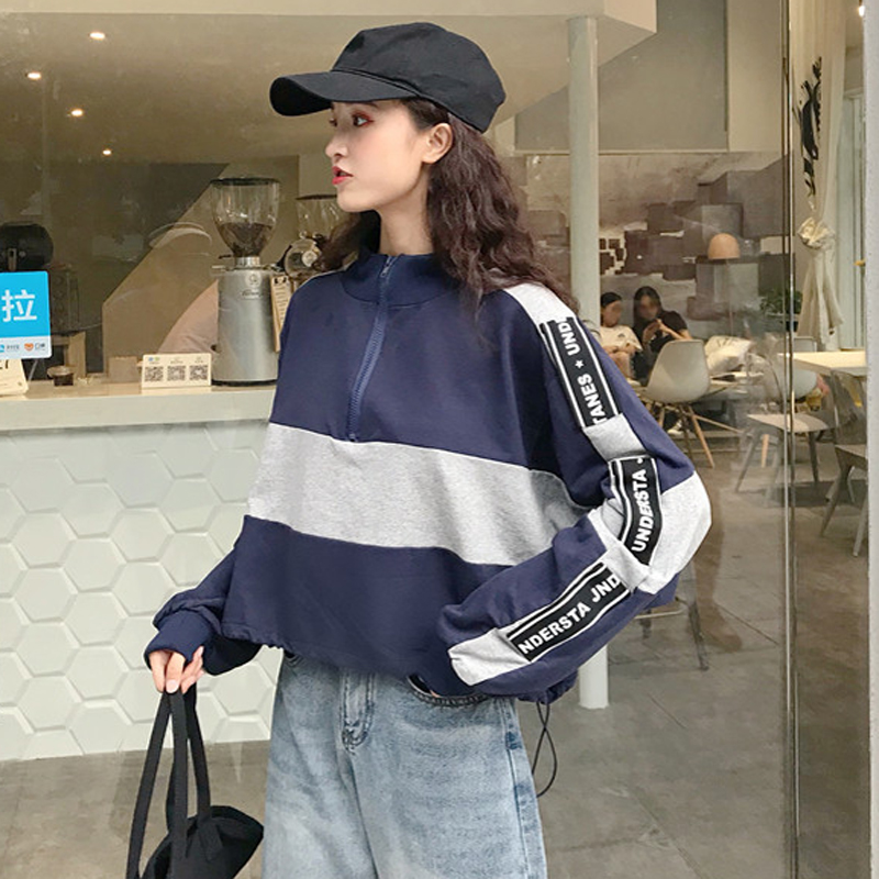 / 秋季韓版原宿風立領寬松拼色短款學生長袖拉鏈套頭衛衣上衣外套女