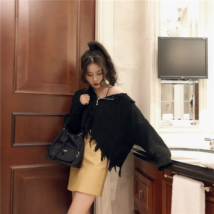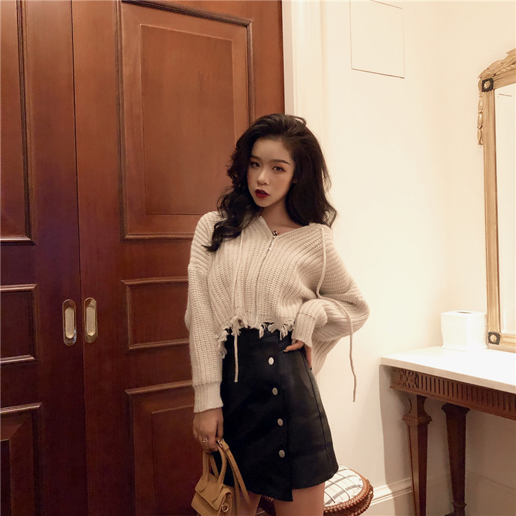 時尚復古秋裝女2018新款溫柔顯瘦連帽開衫拉鏈短款流蘇破洞毛衣潮