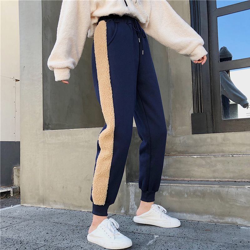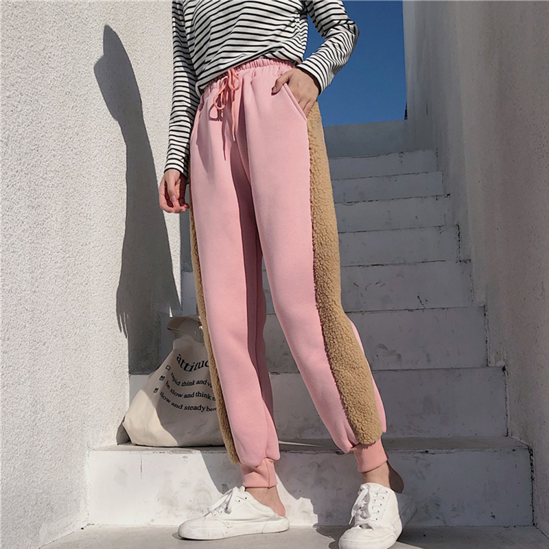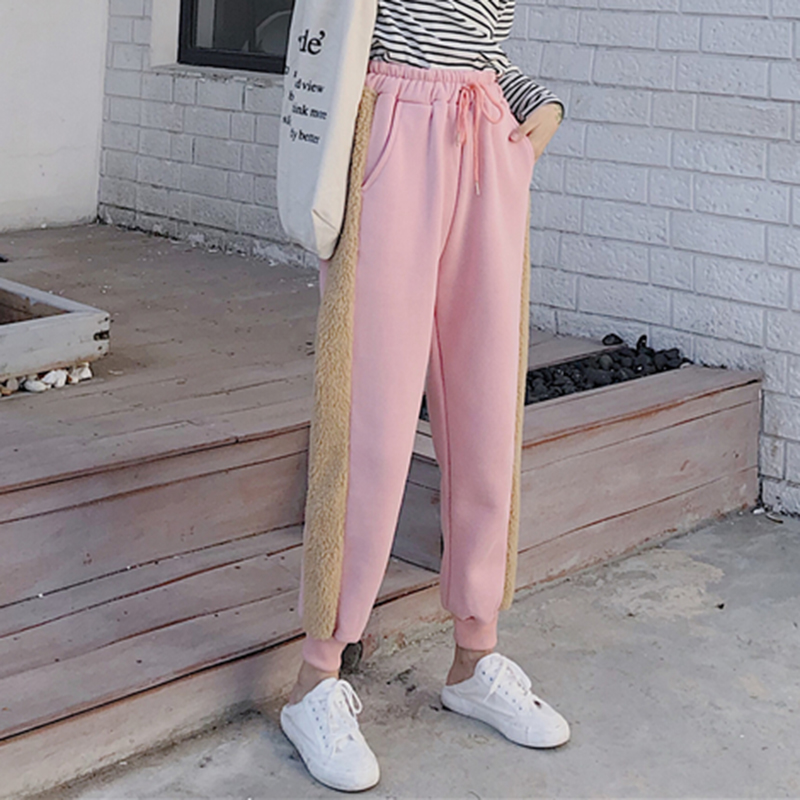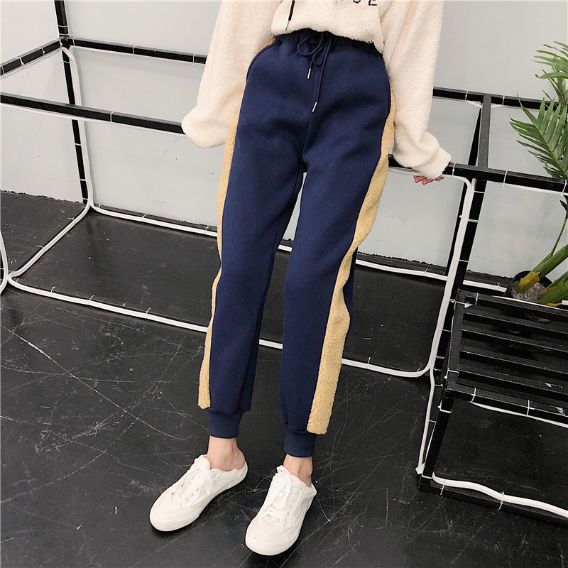/ 羊羔毛拼接加絨休閑褲子女秋冬裝新款學生高腰顯瘦寬松哈倫長褲潮