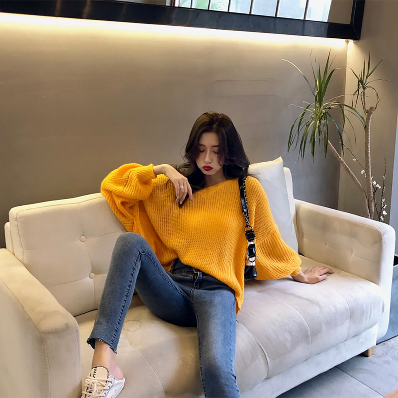 chic早秋上衣慵懶寬松糖果色網紅毛衣女韓版純色時尚V領針織衫潮