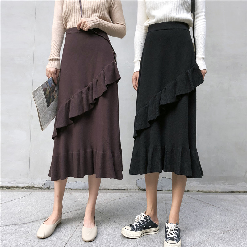 / 港味女秋裝2018新款裙子百搭A字裙針織高腰中長款荷葉邊半身裙潮