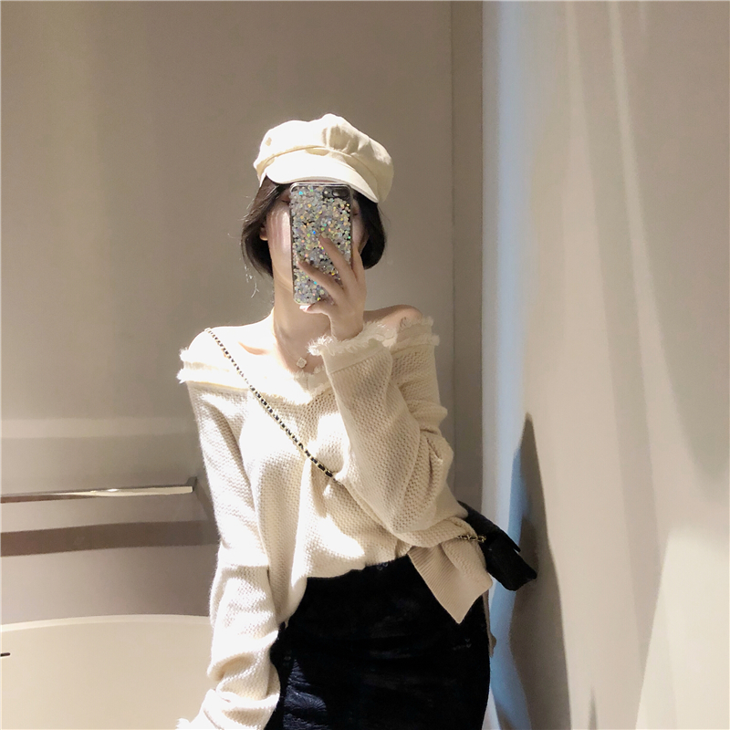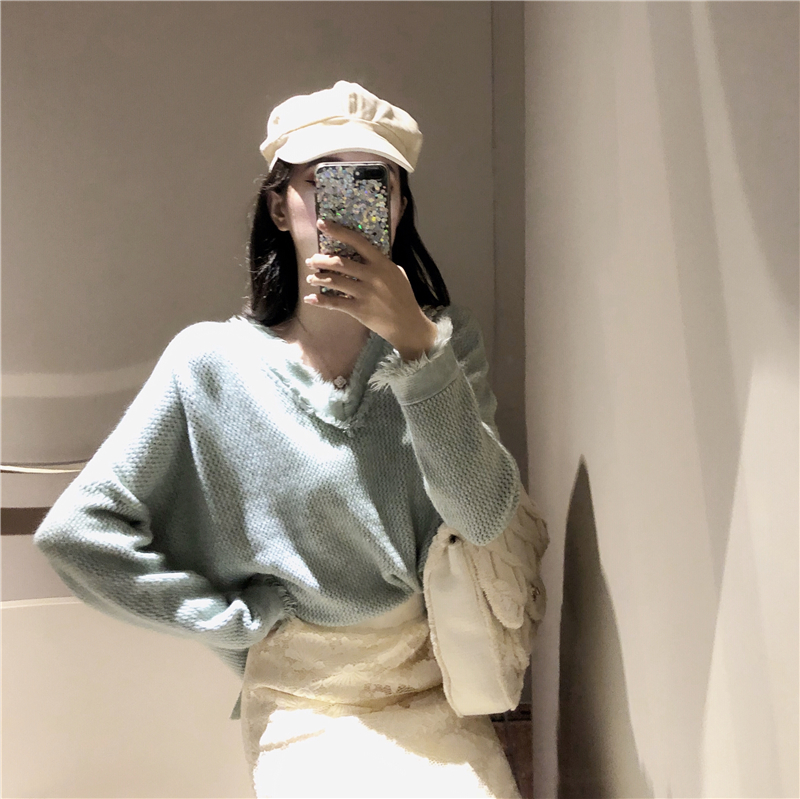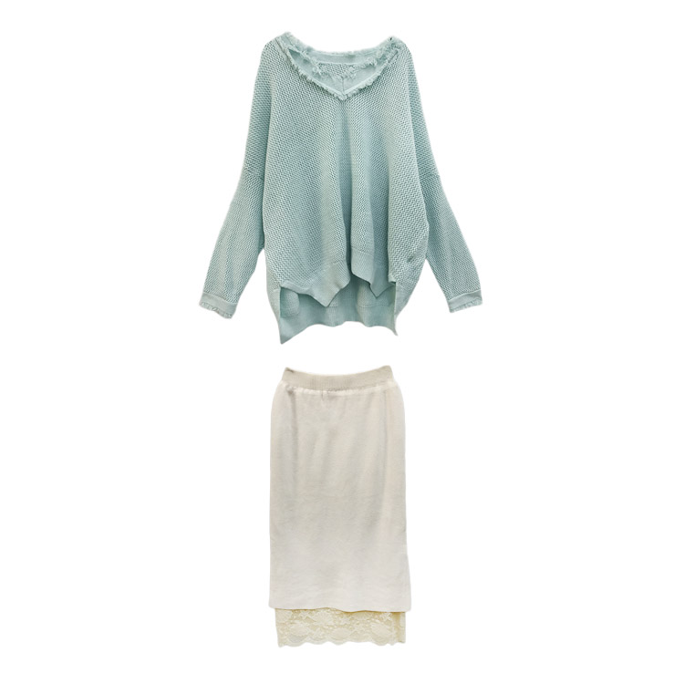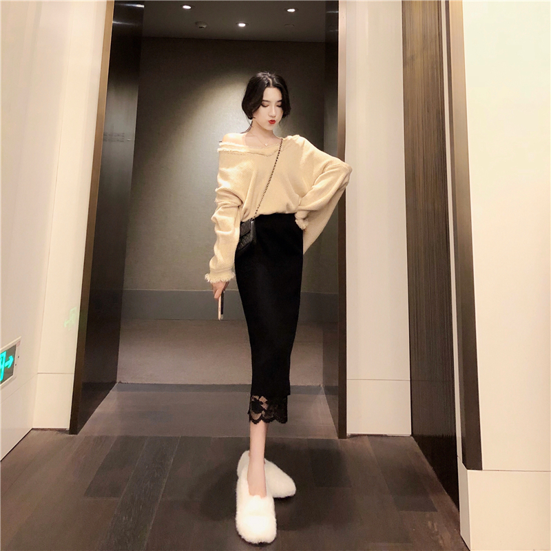 / 女神套裝秋兩件套V領寬松貓須毛衣+兩穿百搭蕾絲拼接針織半身裙潮