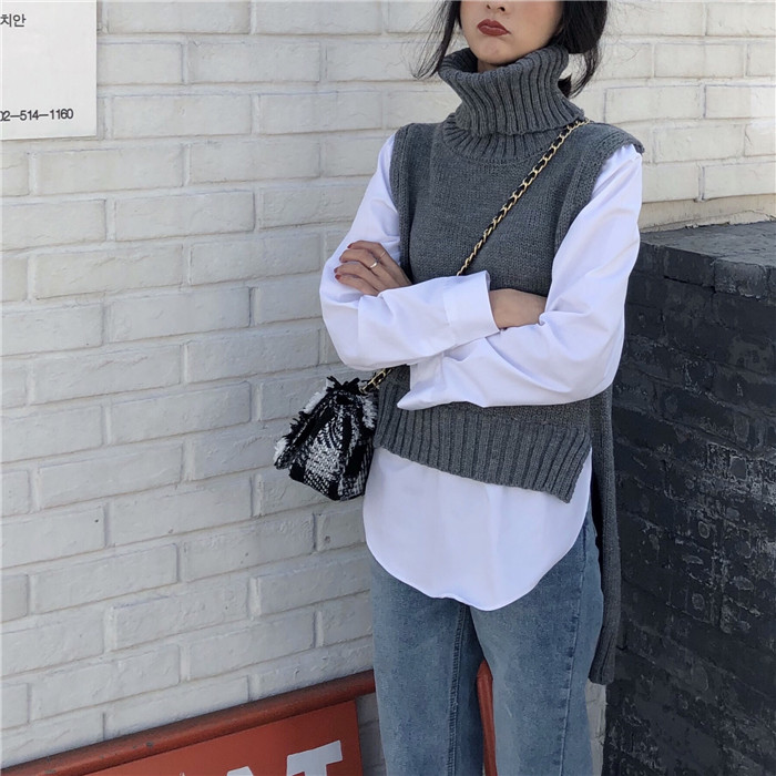 / 毛衣女2018新款時尚韓版氣質高領百搭襯衫拼接前短后長假兩件上衣