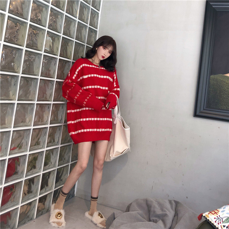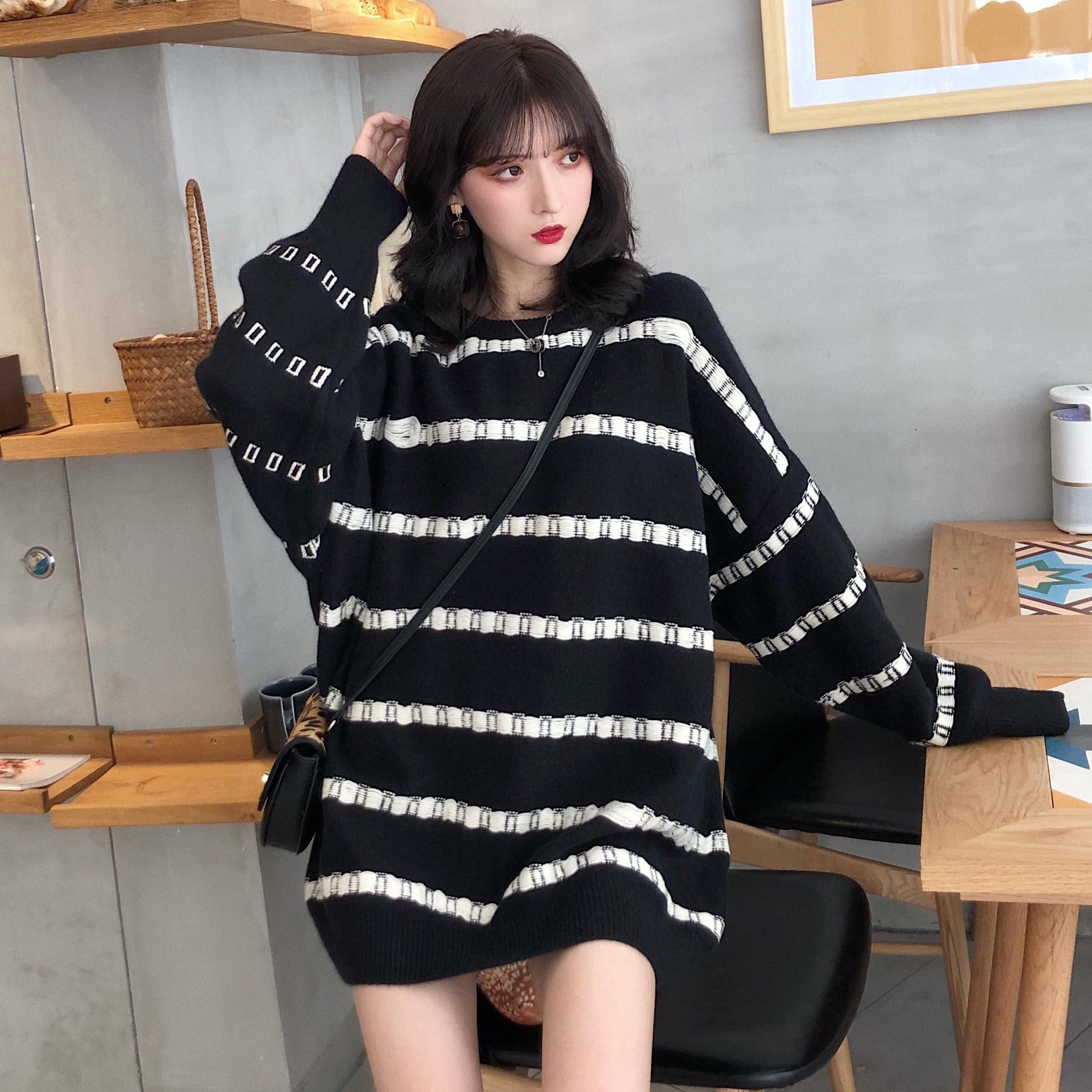 / 韓版chic百搭慵懶風oversize毛衣女寬松顯瘦條紋中長款減齡毛線衣