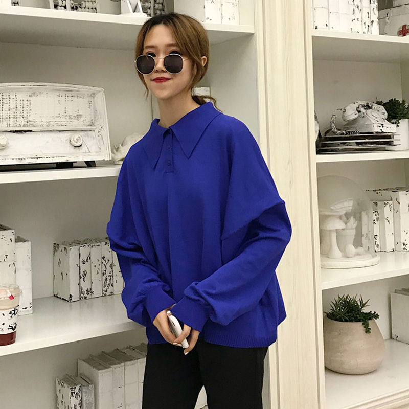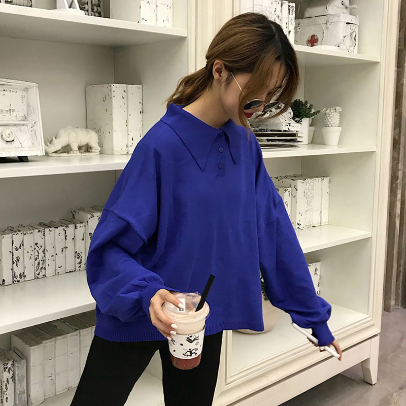復古POLO領慵懶風針織衫女秋裝新款休閑黑色外套寬松燈籠長袖上衣
