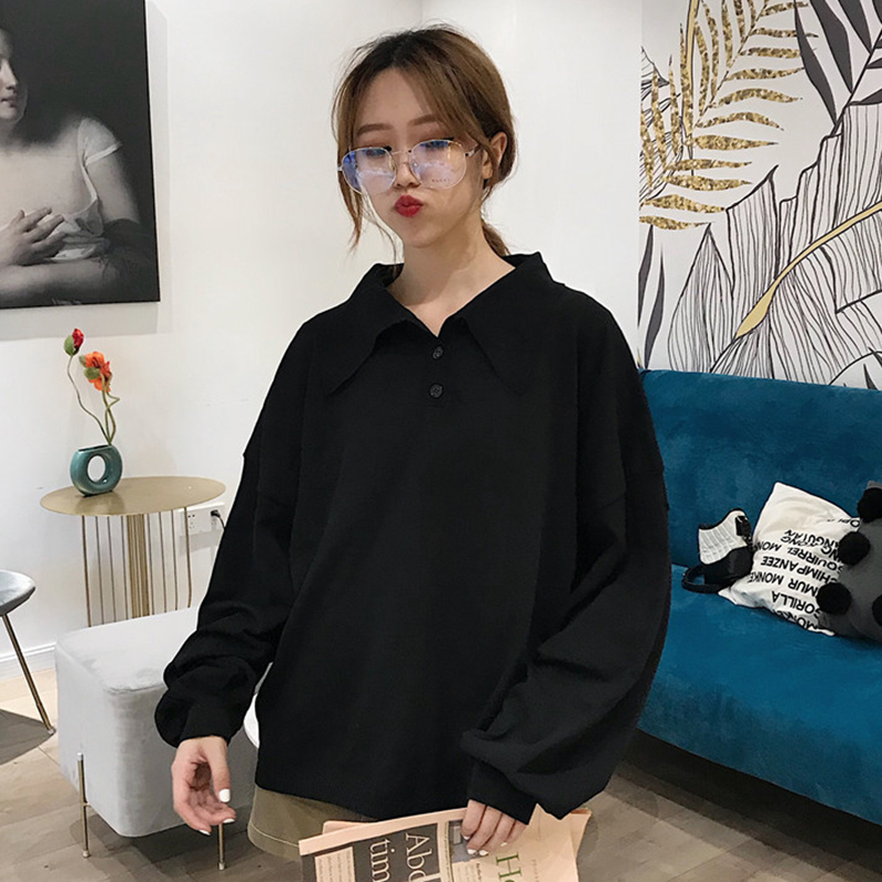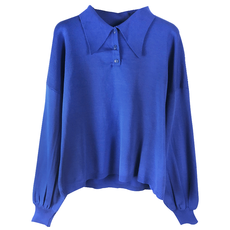 / 復古POLO領慵懶風針織衫女秋裝新款休閑黑色外套寬松燈籠長袖上衣
