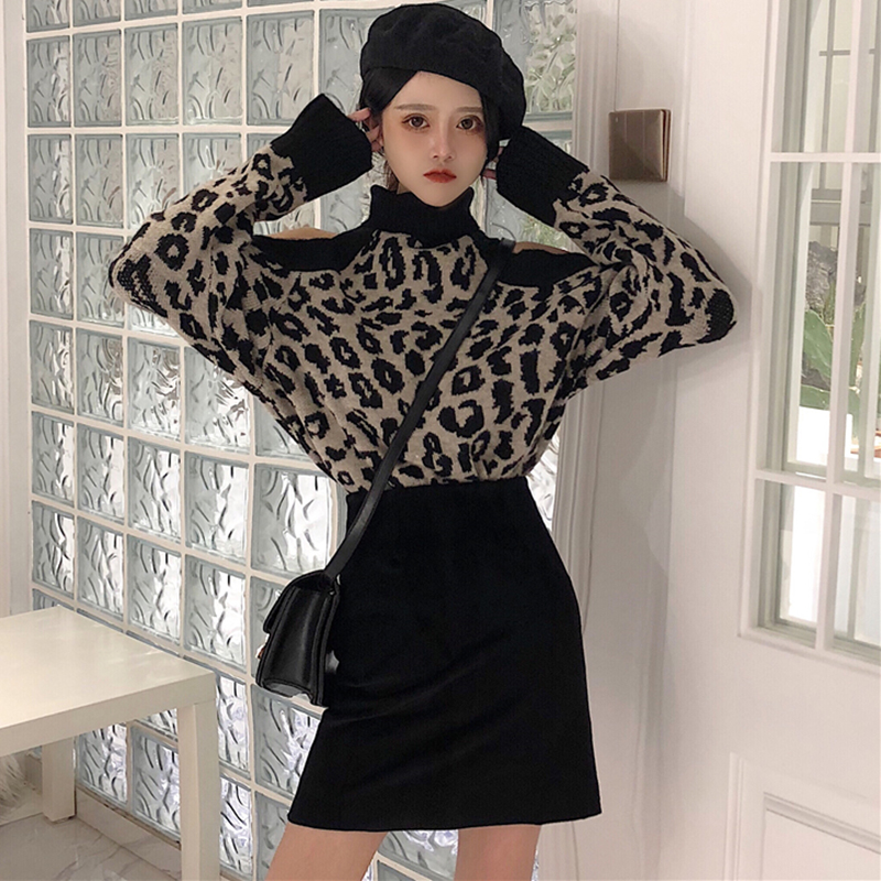 / 御姐套裝女秋冬新款露肩時尚豹紋針織外套高腰顯瘦A字包臀半身裙