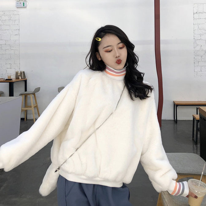 / 韓版慵懶風上衣女寬松百搭高領套頭長袖毛毛衛衣女配送毛毛包包女