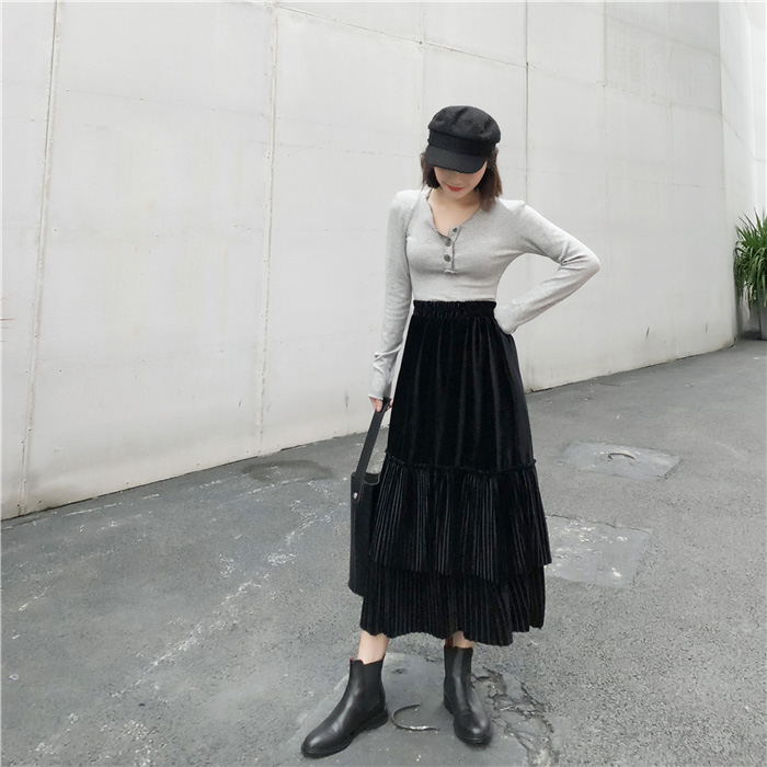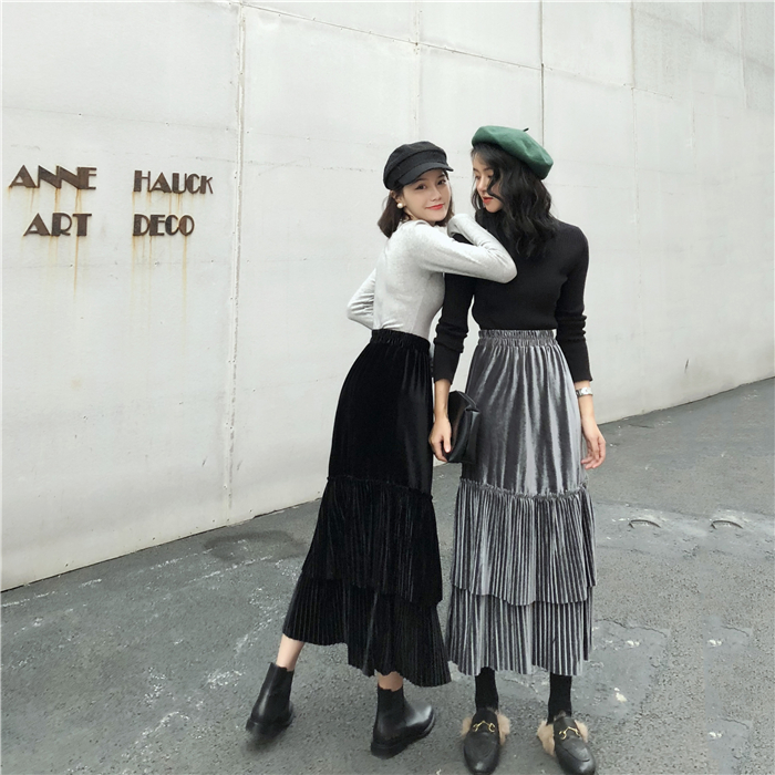 裙子女秋冬新款韓版寬松百搭絲絨百褶裙半身裙高腰A字裙學生長裙