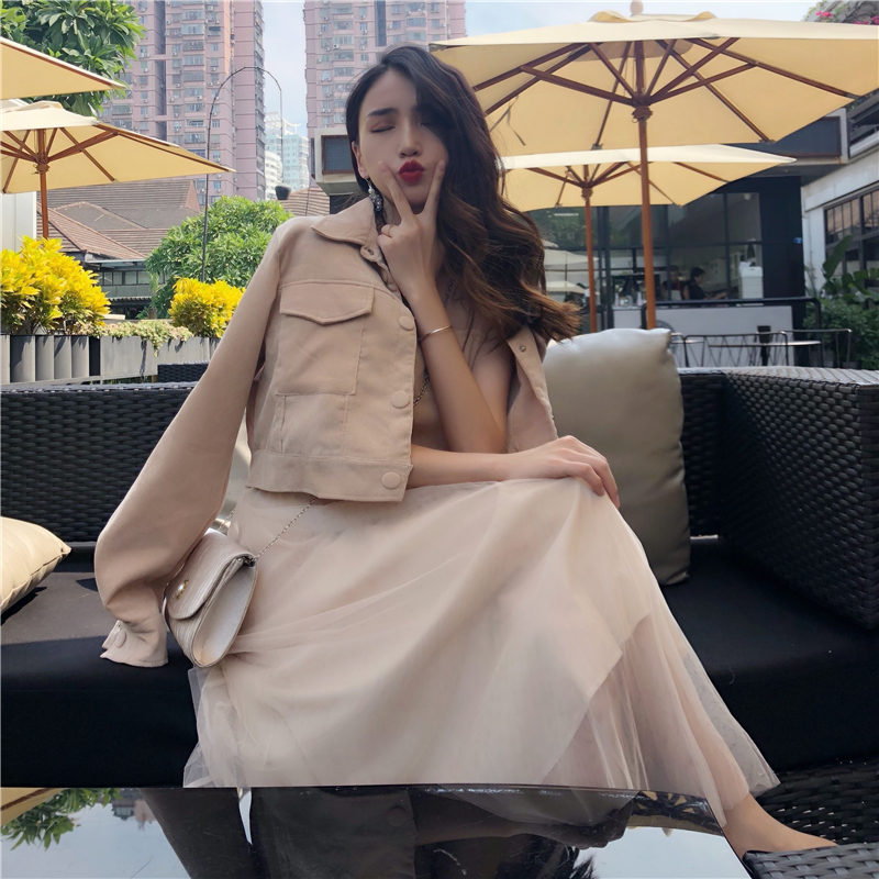 時尚套裝女新款韓版氣質吊帶燈芯絨拼接網紗連衣裙短款外套兩件套