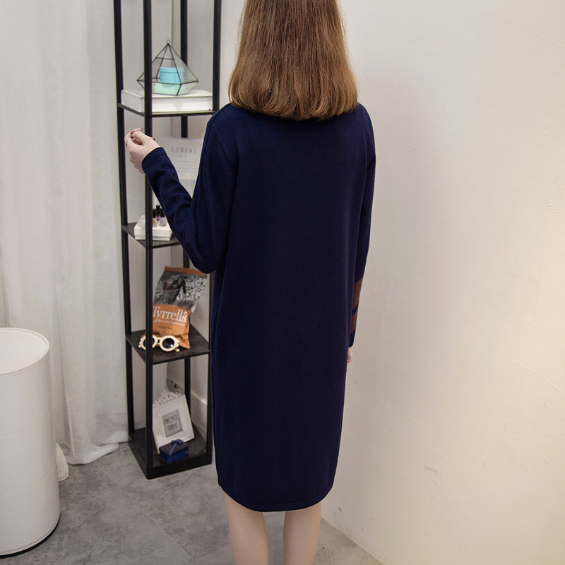 秋冬裝套頭圓領針織衫打底衫韓版圓領寬松拼色外套中長款毛衣裙女