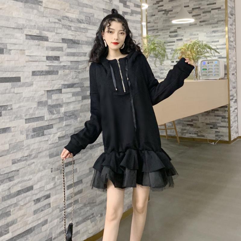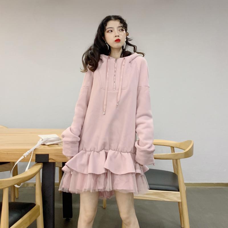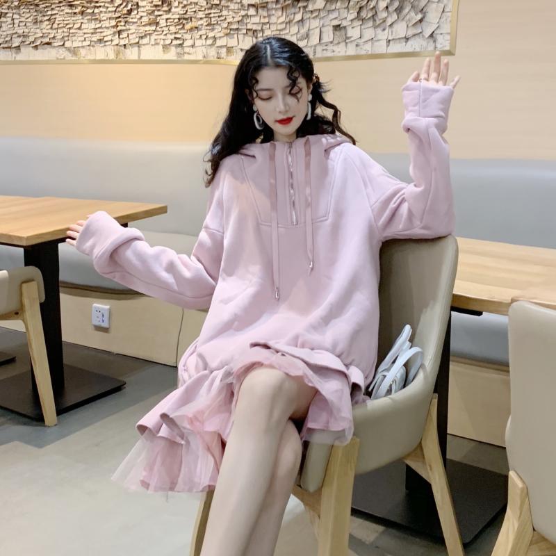 / 港味裙子女秋冬2018新款百搭帶帽加絨加厚寬松衛衣拼接網紗連衣裙