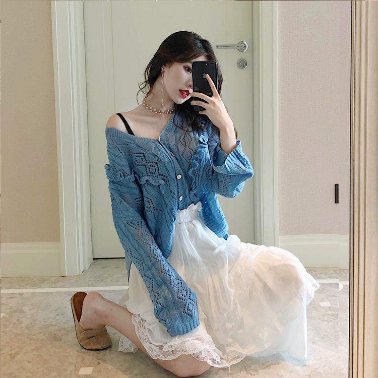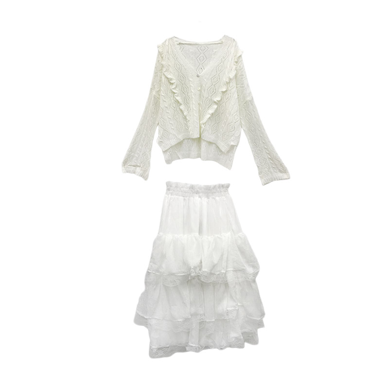 秋裝女2018新款套裝網紅單排扣V領荷葉邊針織長袖+仙女蕾絲蛋糕裙