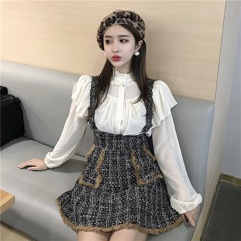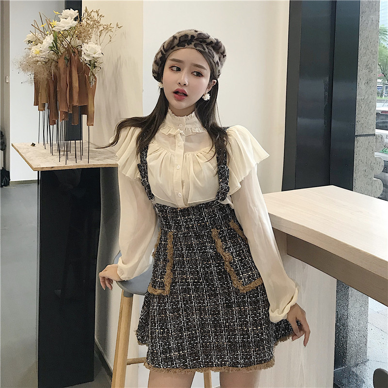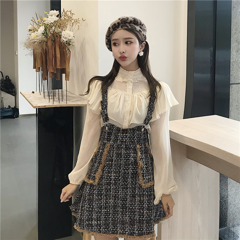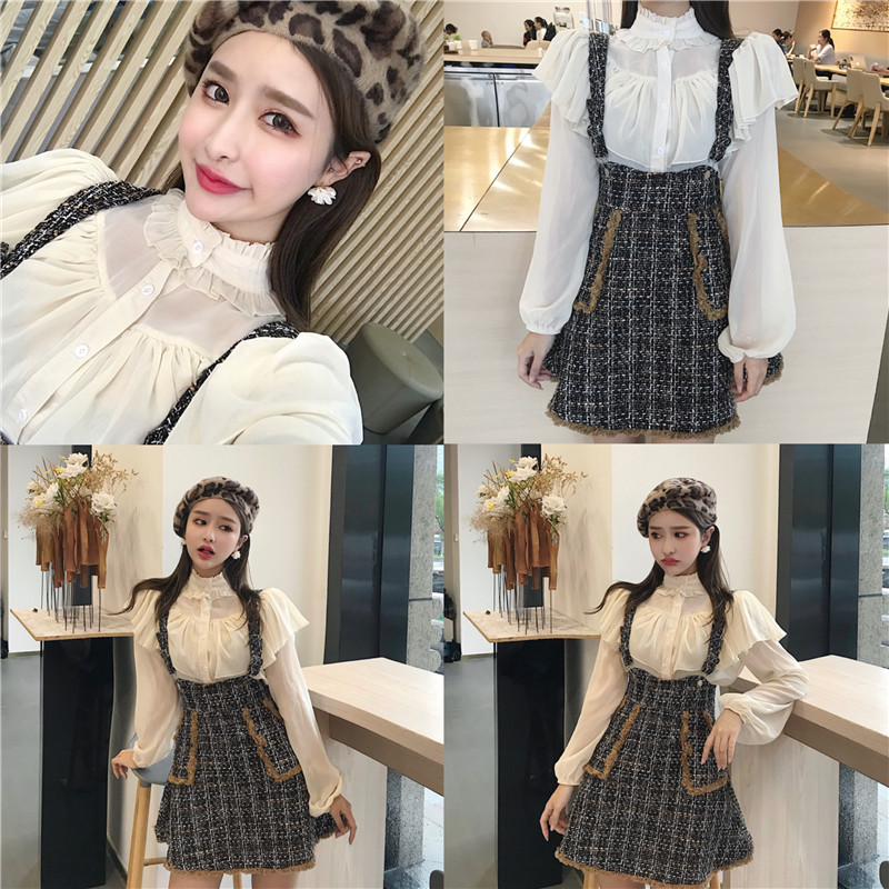 / 韓風chic甜美木耳邊燈籠袖娃娃衫上衣高腰流蘇背帶裙港風時尚套裝