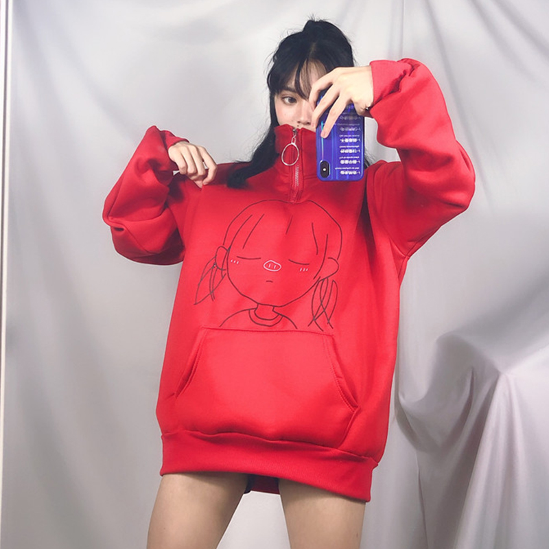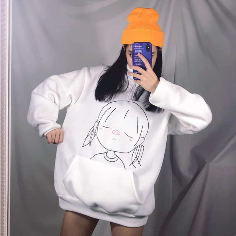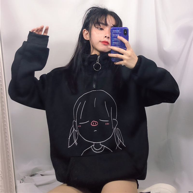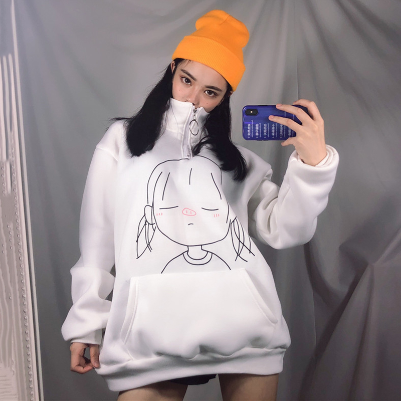 / 卡通印花加絨衛衣秋裝女2018新款寬松長袖上衣學院風立領時尚外套