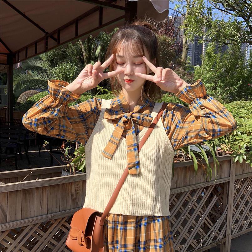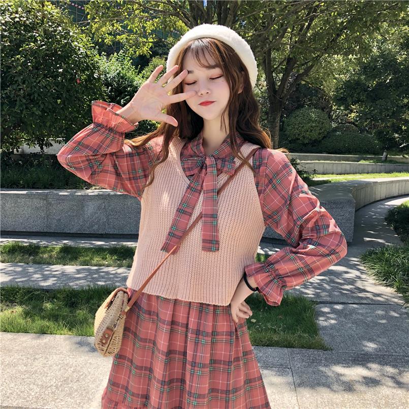 / 韓版時尚休閑套裝秋季女裝chic小清新格子連衣裙+針織馬甲兩件套