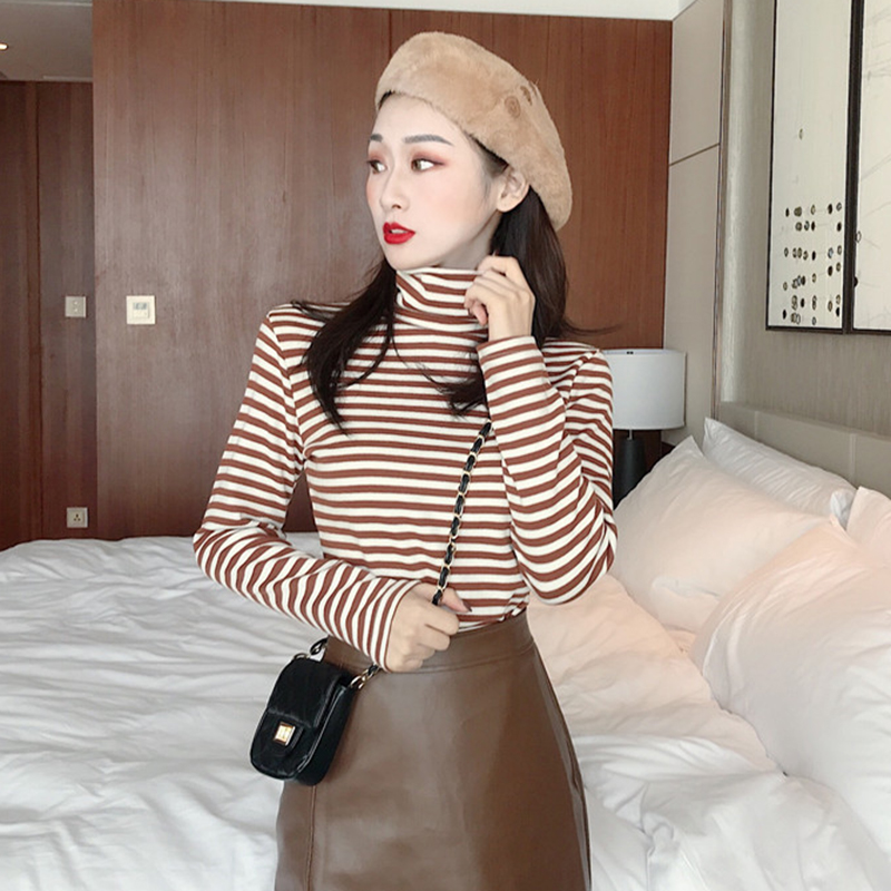 chic高領條紋顯瘦打底衫女冬裝2018新款韓版學生百搭長袖T恤上衣