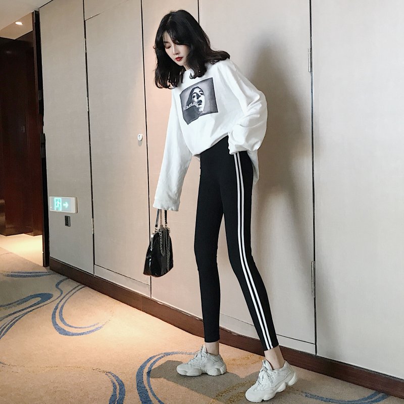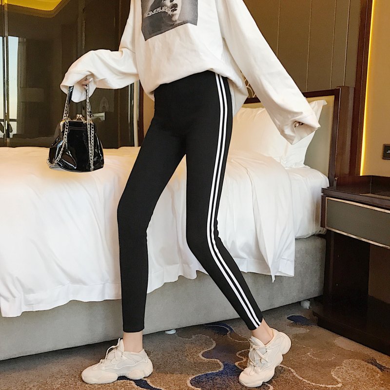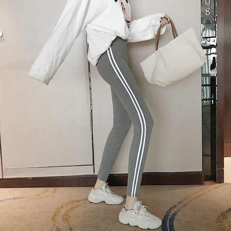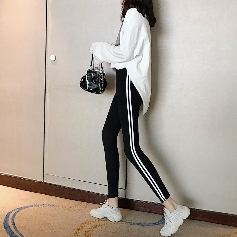 / 褲子女2018新款百搭高腰側白條緊身顯瘦豎條紋小腳褲外穿打底褲潮