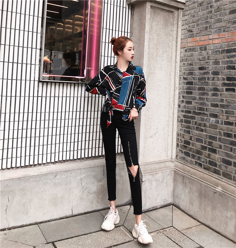 / 秋季韓版個性拉鏈膝蓋破洞黑色牛仔褲高腰緊身彈力九分褲小腳褲女