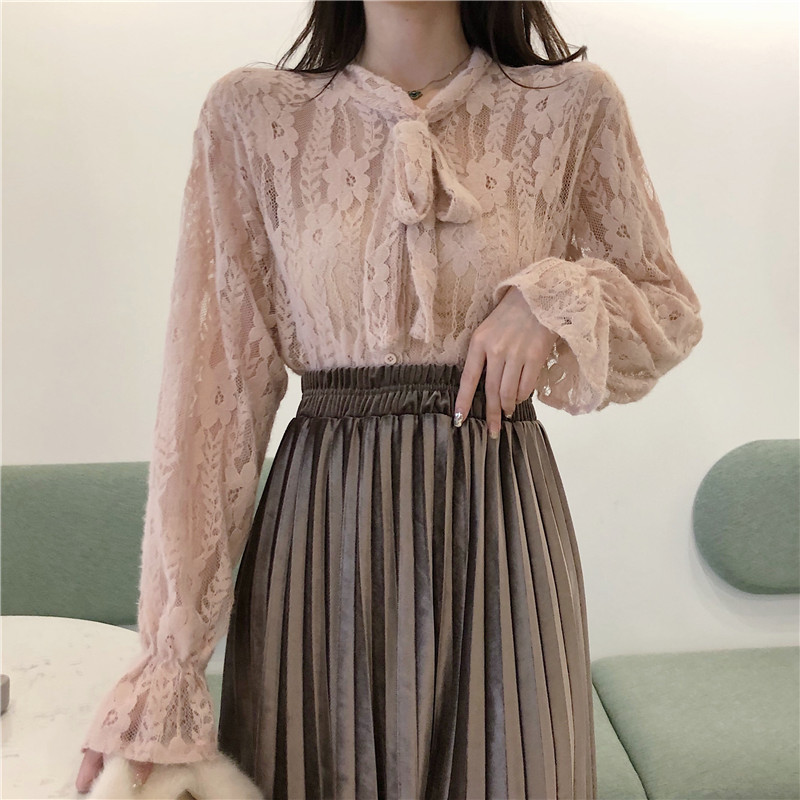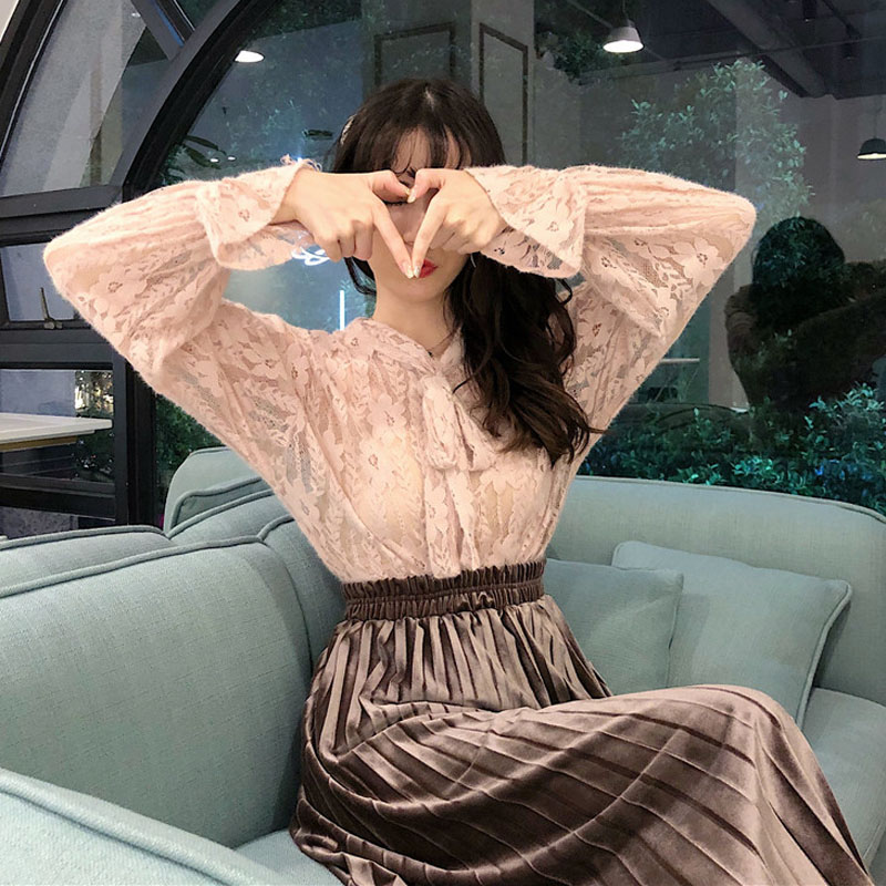 / 2018港味秋冬蕾絲仙女氣質打底襯衫優雅百褶絲絨半身裙時尚套裝潮