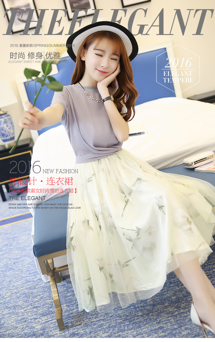 / 春夏新款韓版女收腰短裙套裝印花T恤網紗半身裙兩件套連衣裙