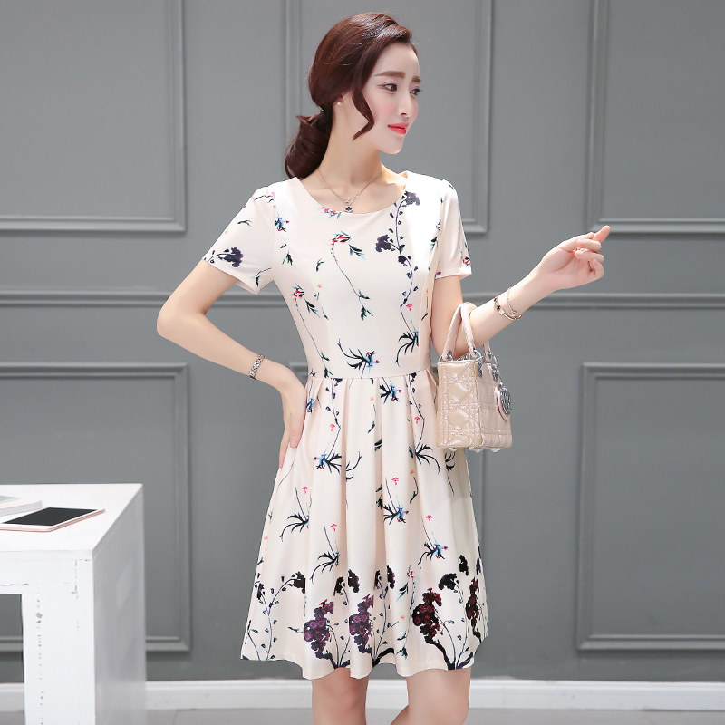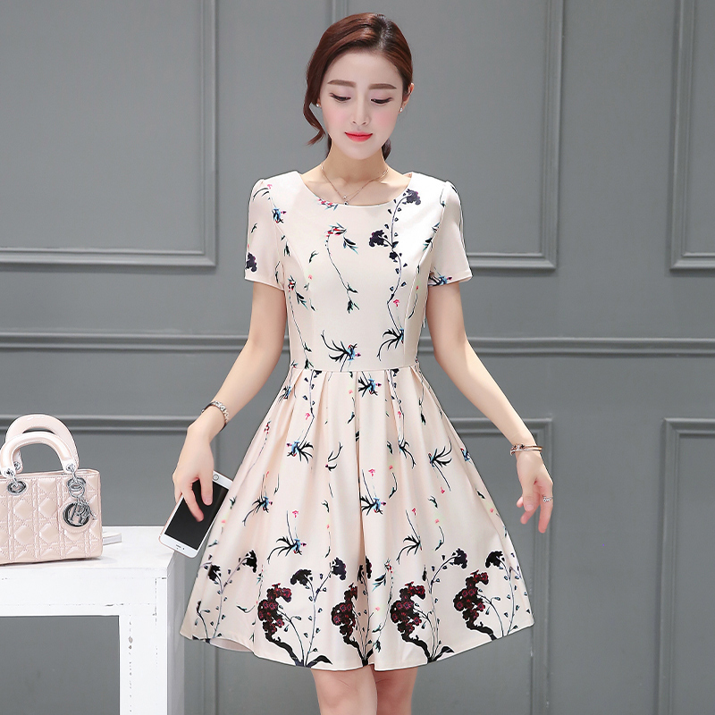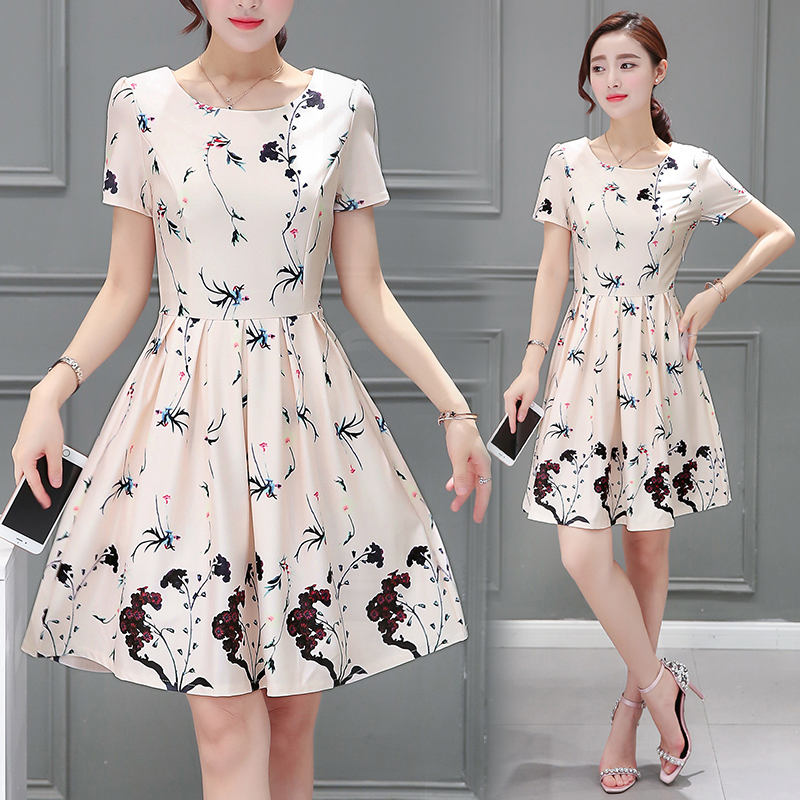 新款夏裝印花雪紡中長款圓領連衣裙女裝修身韓版A字裙蓬蓬裙