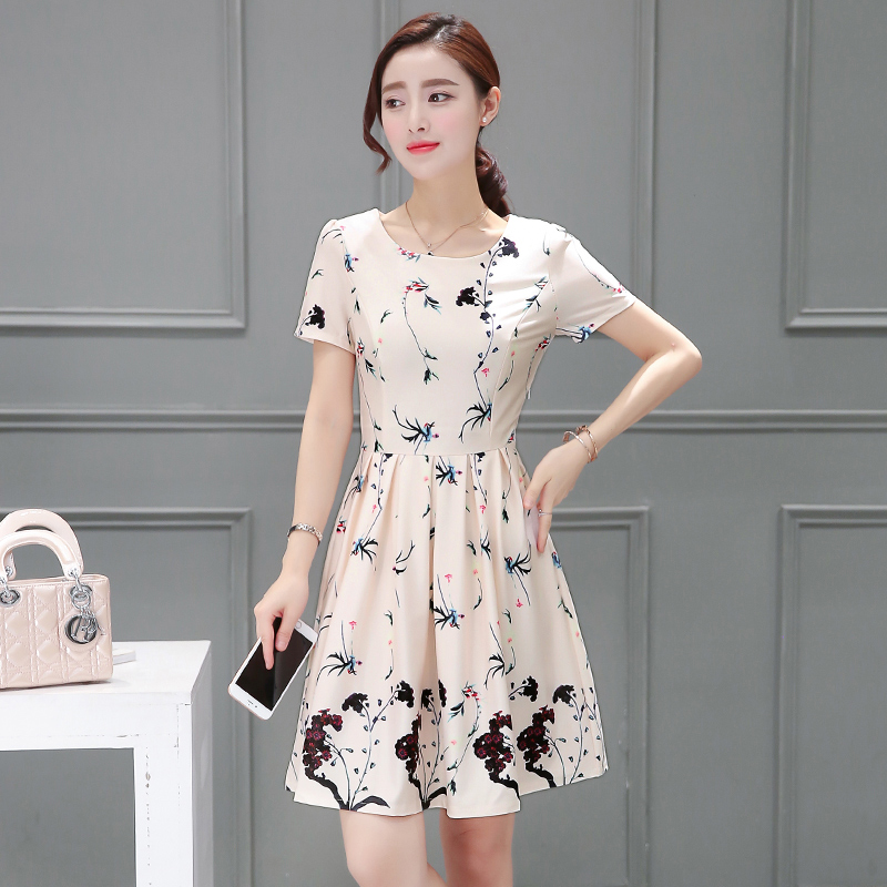 / 新款夏裝印花雪紡中長款圓領連衣裙女裝修身韓版A字裙蓬蓬裙