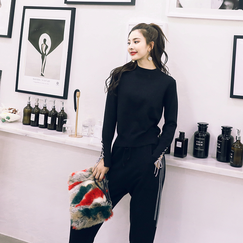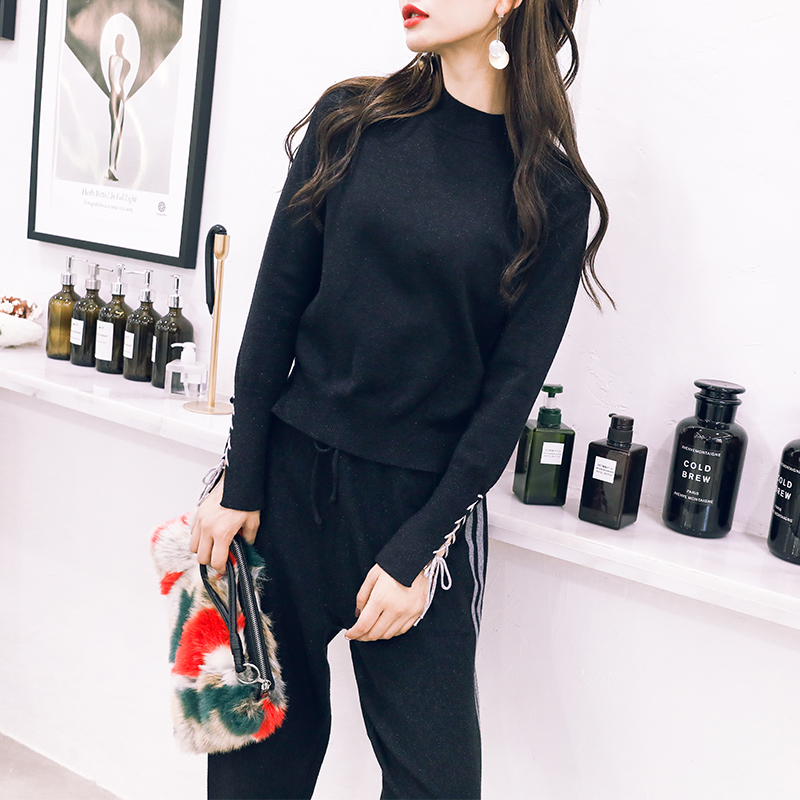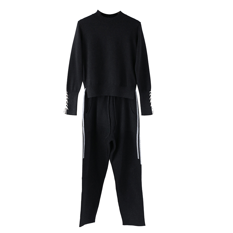 / 歐洲站初秋針織套裝女2018新款黑色衛衣針織衫毛衣休閑長褲兩件套
