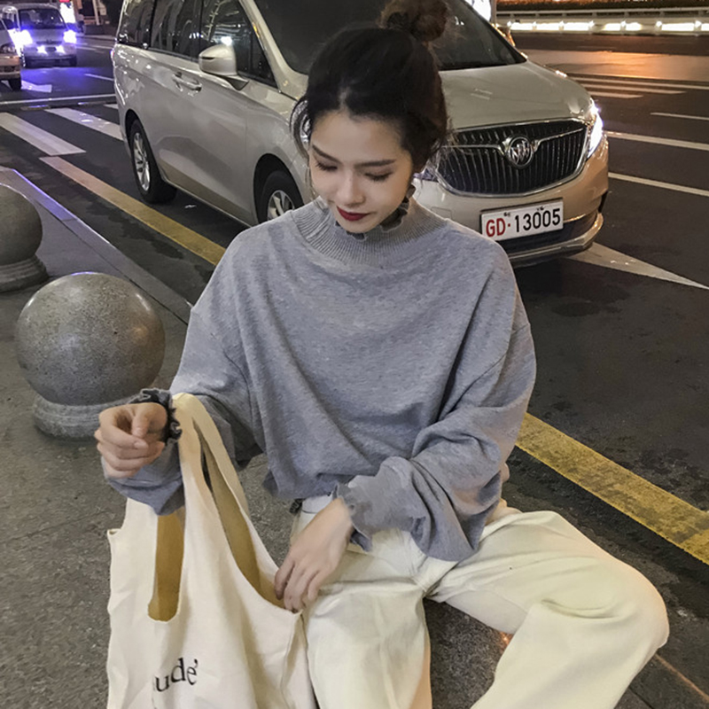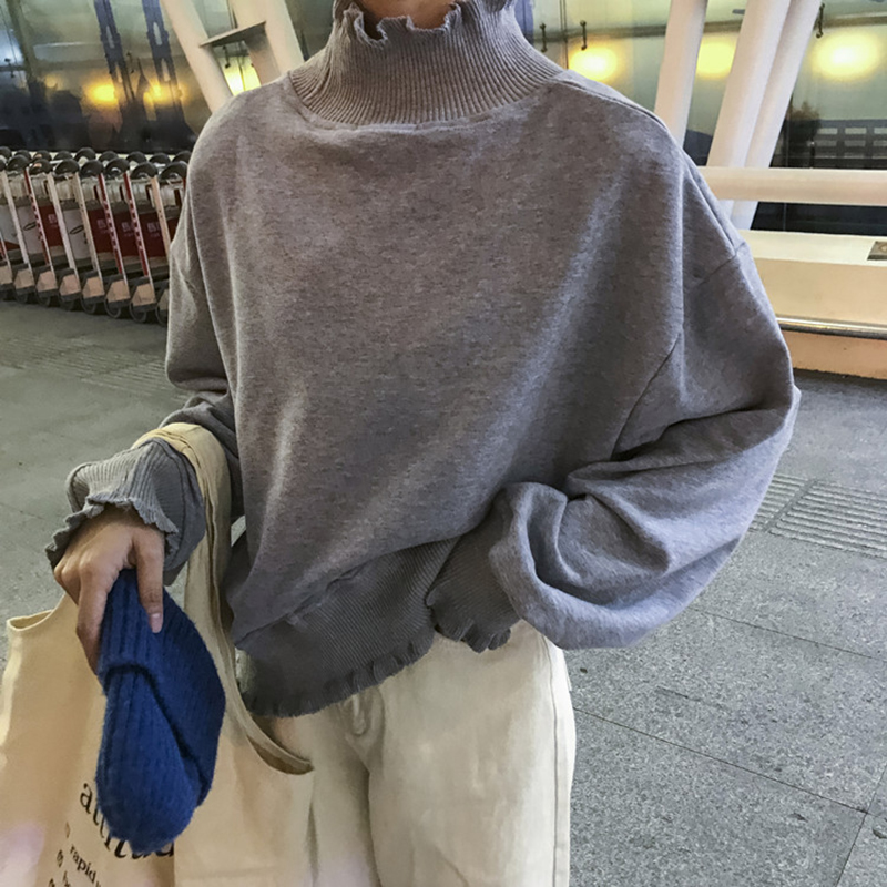 慵懶毛衣秋裝女2018新款長袖寬松加絨衛衣學生木耳邊高領黑色外套