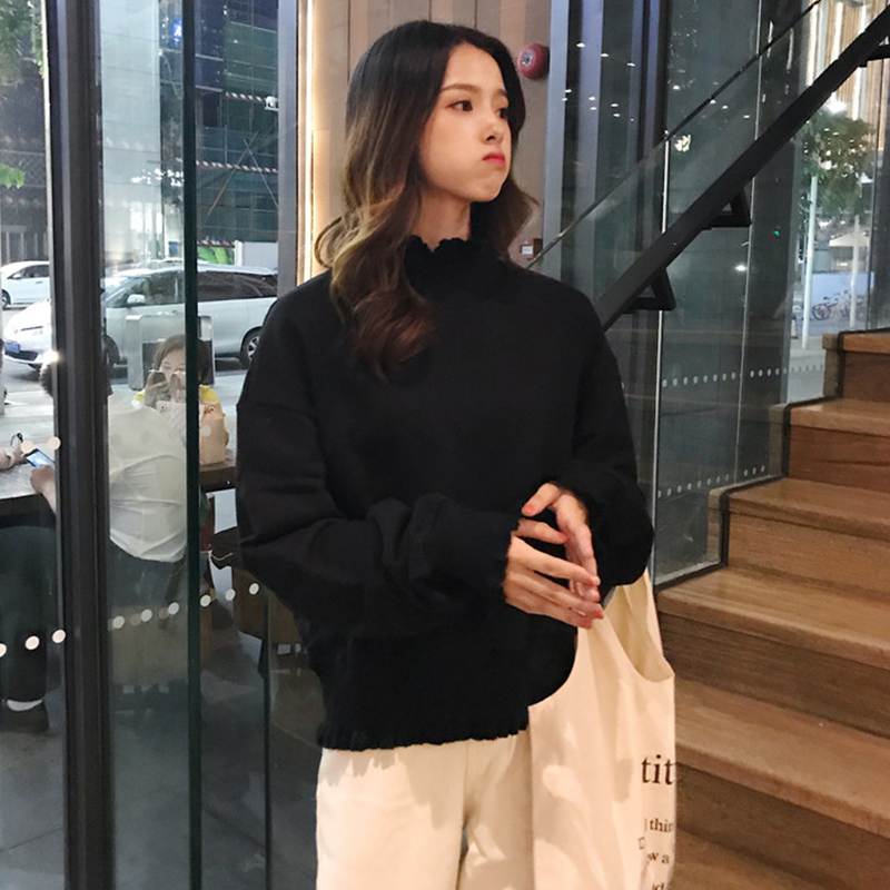 / 慵懶毛衣秋裝女2018新款長袖寬松加絨衛衣學生木耳邊高領黑色外套