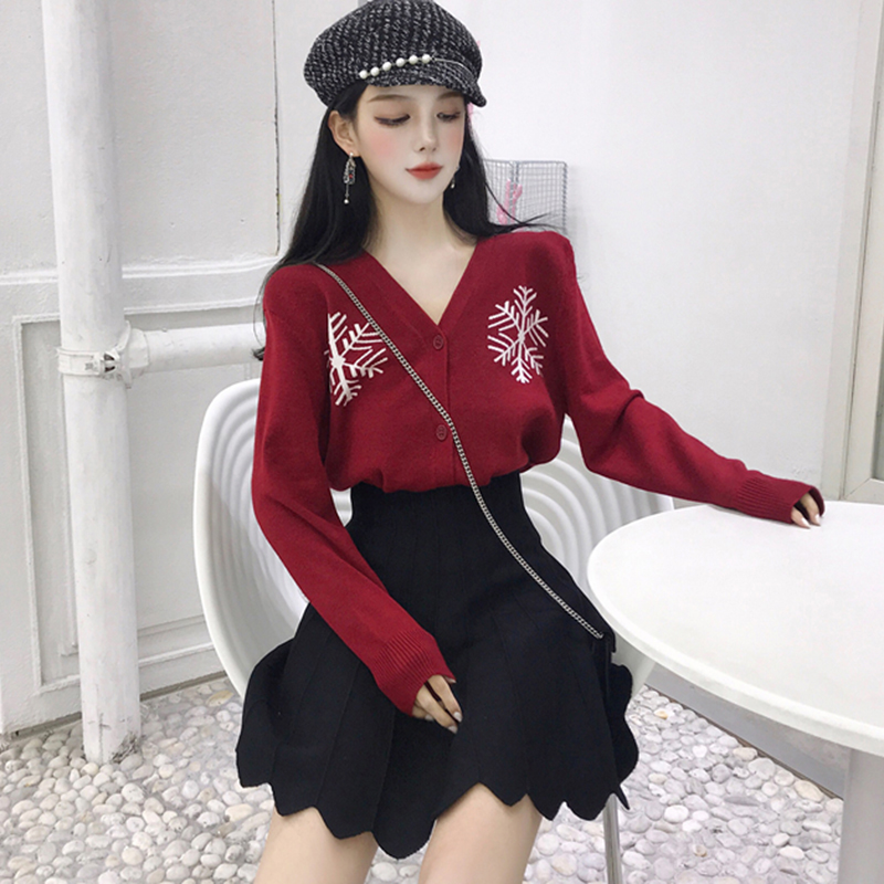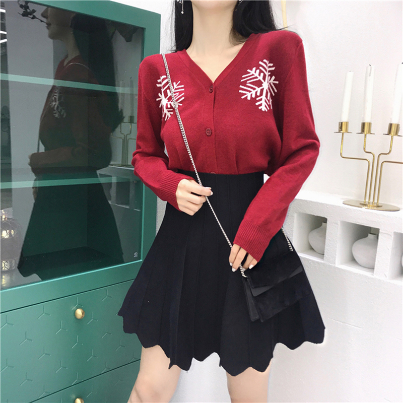 / 赫本風針織套裝女秋冬新款雪花V領開衫外套高腰顯瘦百褶半身裙子