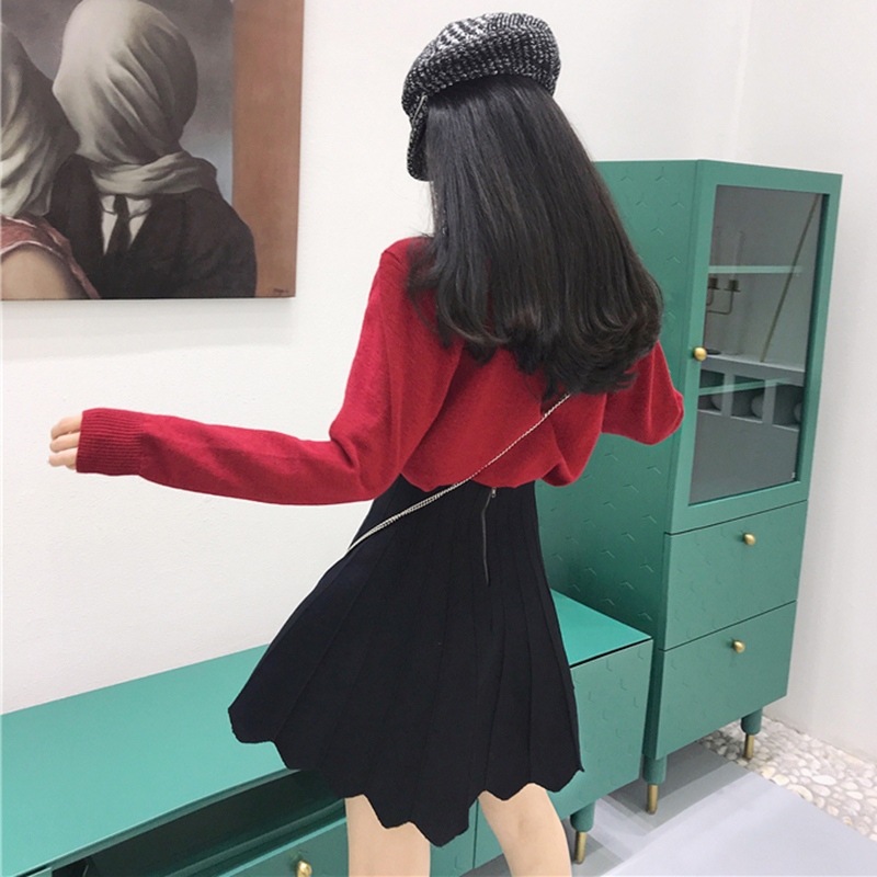 赫本風針織套裝女秋冬新款雪花V領開衫外套高腰顯瘦百褶半身裙子
