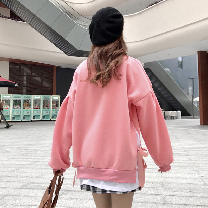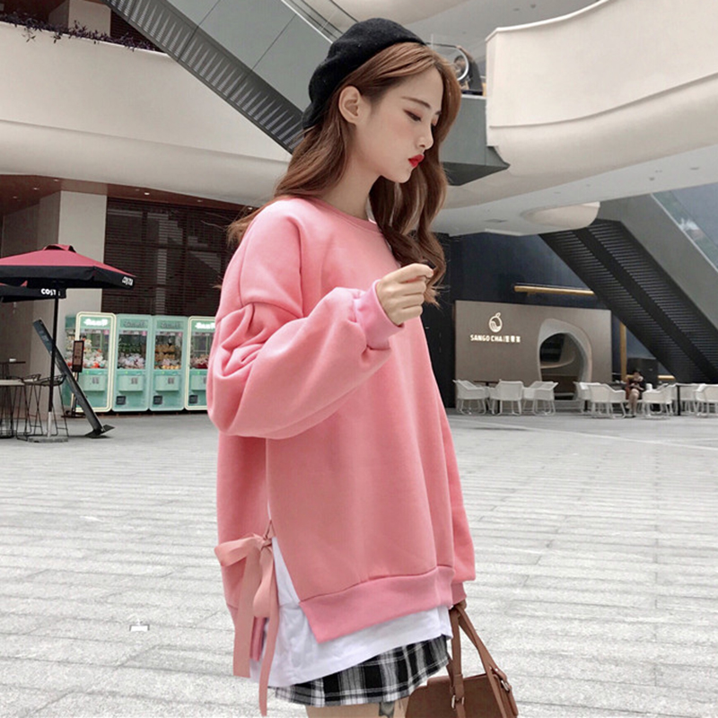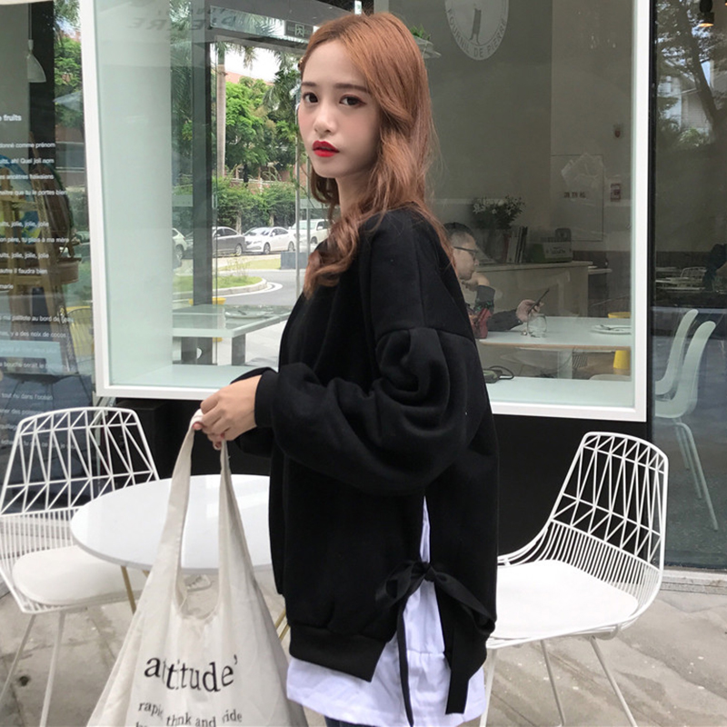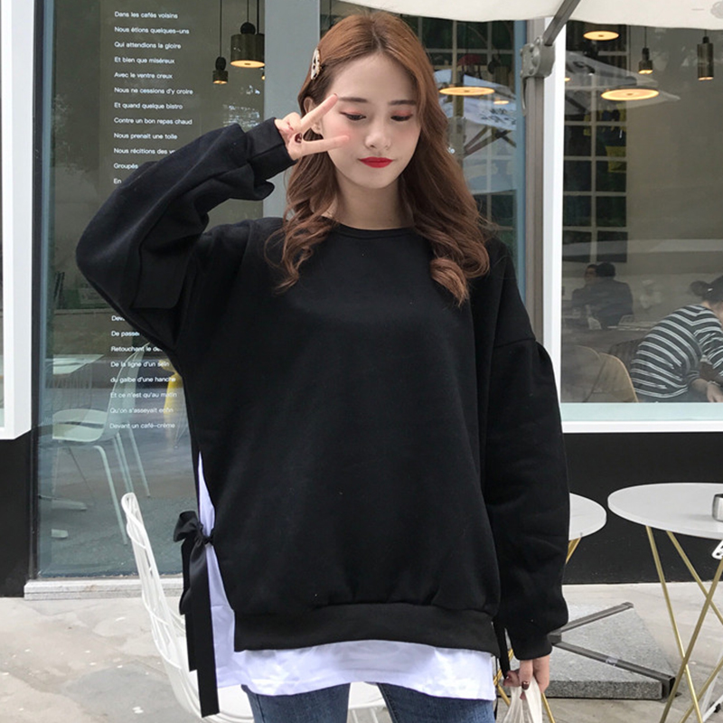 / 時尚拼色假兩件外套秋冬女裝新款蝴蝶結加絨衛衣學生寬松長袖上衣