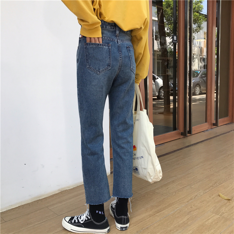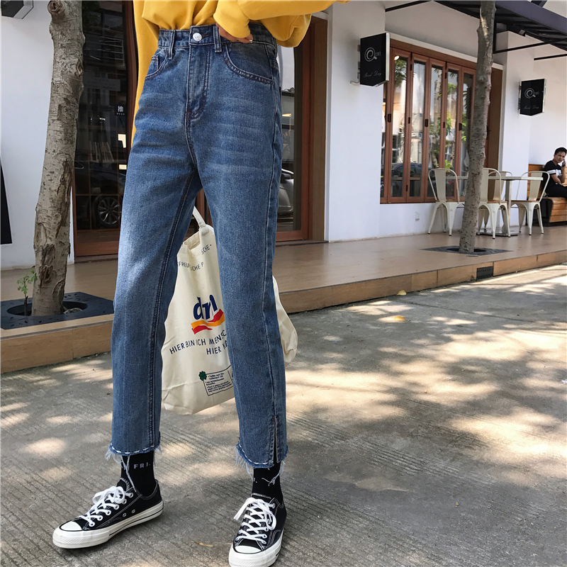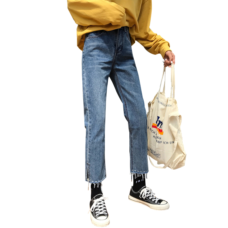 / 秋裝女裝韓版個性褲腳開叉毛邊直筒褲高腰牛仔褲顯瘦九分褲休閑褲