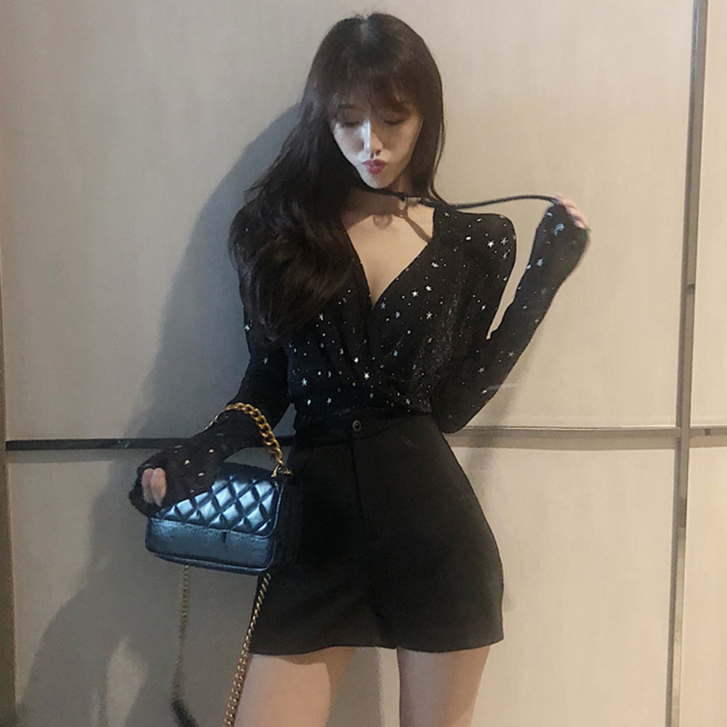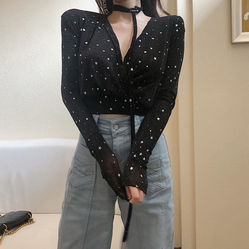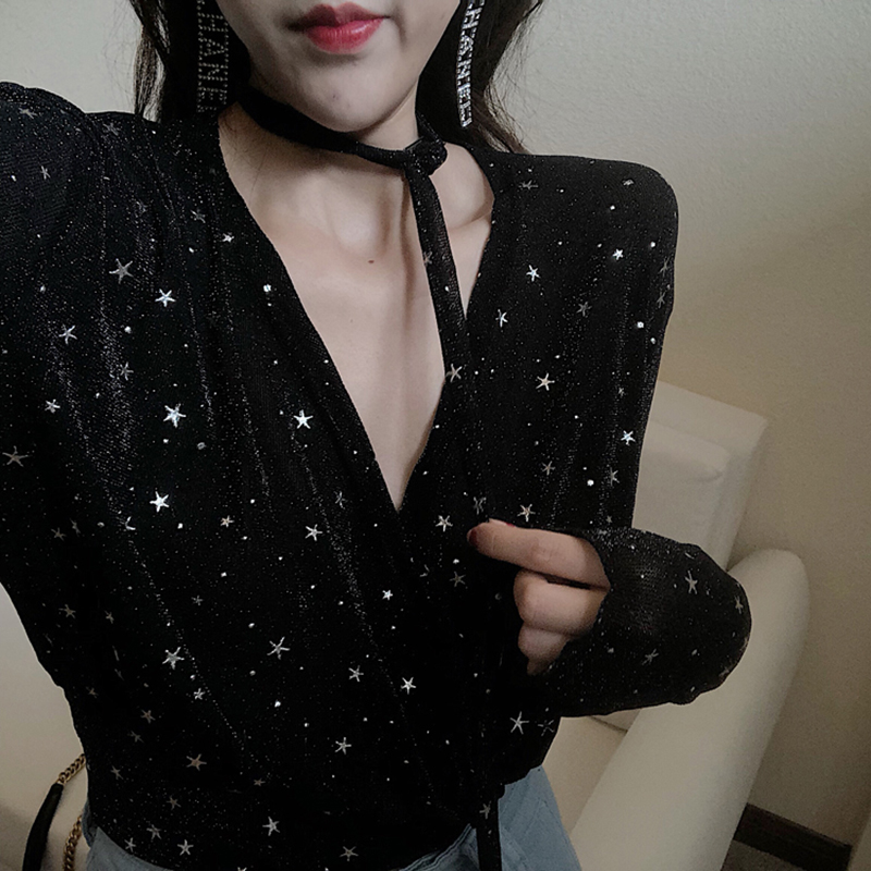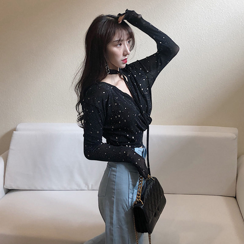 港味chic星星V領長袖襯衫女秋冬裝2018新款韓版氣質顯瘦打底上衣