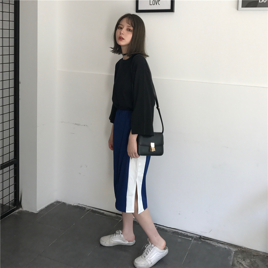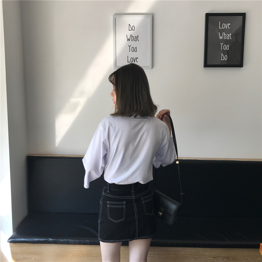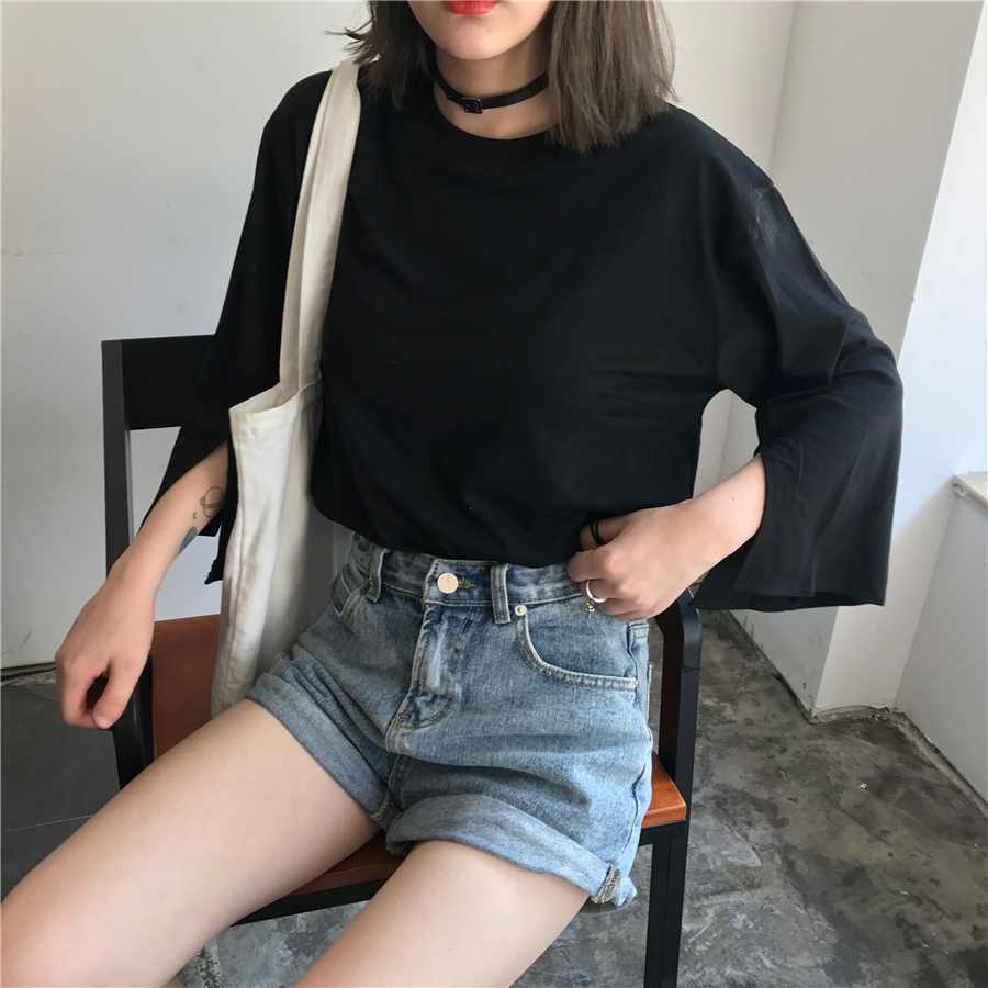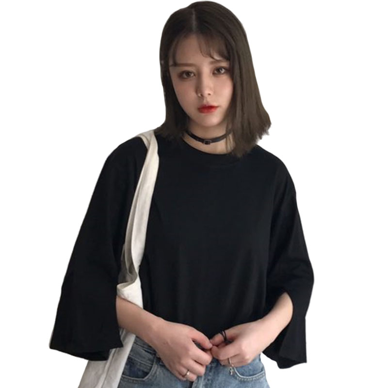/ 春夏女裝韓版寬松簡約純色袖子開叉短袖T恤學生中袖打底衫上衣潮