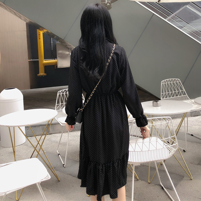 / 復古蝴蝶結波點中長雪紡連衣裙子秋冬裝新款法式少女荷葉邊桔梗裙