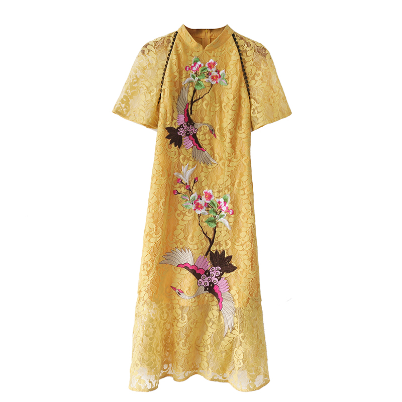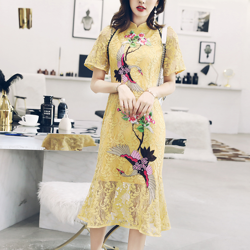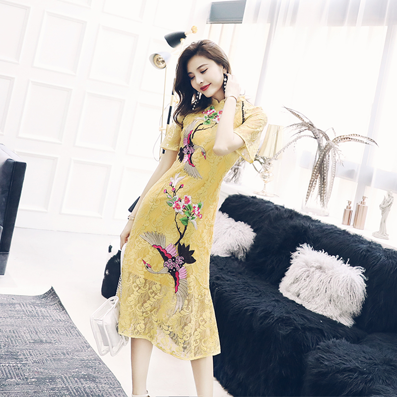 氣質淑女2018夏裝新款女裝修身刺繡蕾絲少女旗袍改良連衣裙中長款
