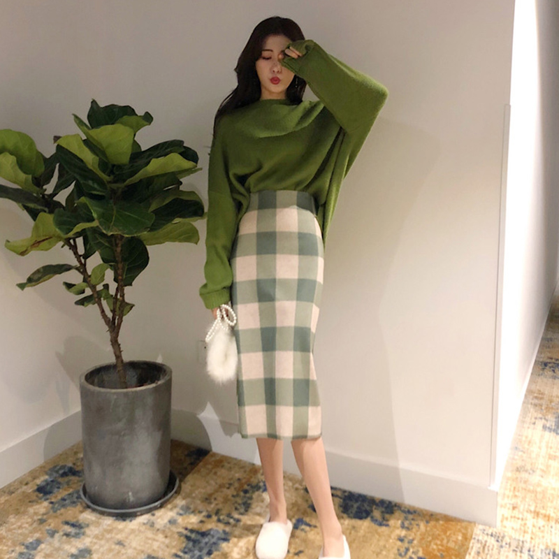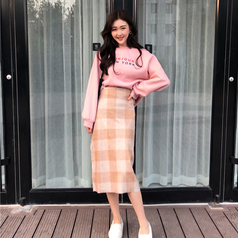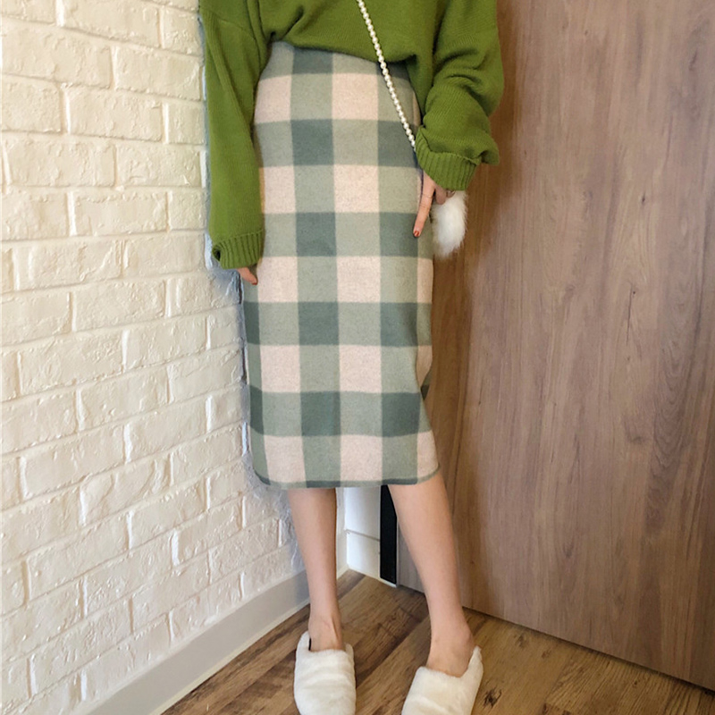 秋冬女裝2018新款復古格子開叉毛呢半身裙學生高腰顯瘦包臀中長裙