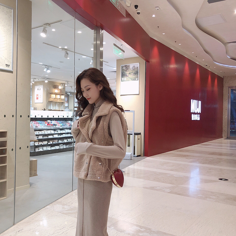 女神套裝秋長袖打底小高領T恤+羊圈毛呢背心馬甲+針織半裙三件套