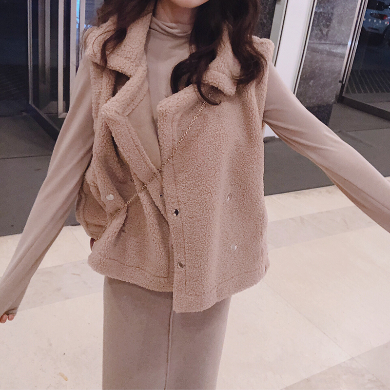 / 女神套裝秋長袖打底小高領T恤+羊圈毛呢背心馬甲+針織半裙三件套