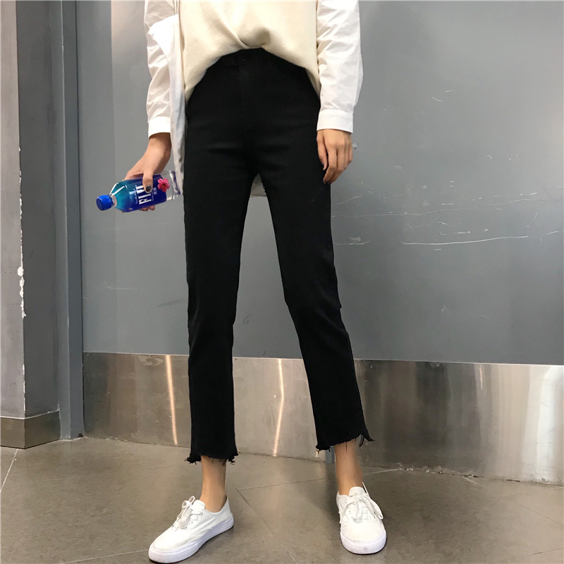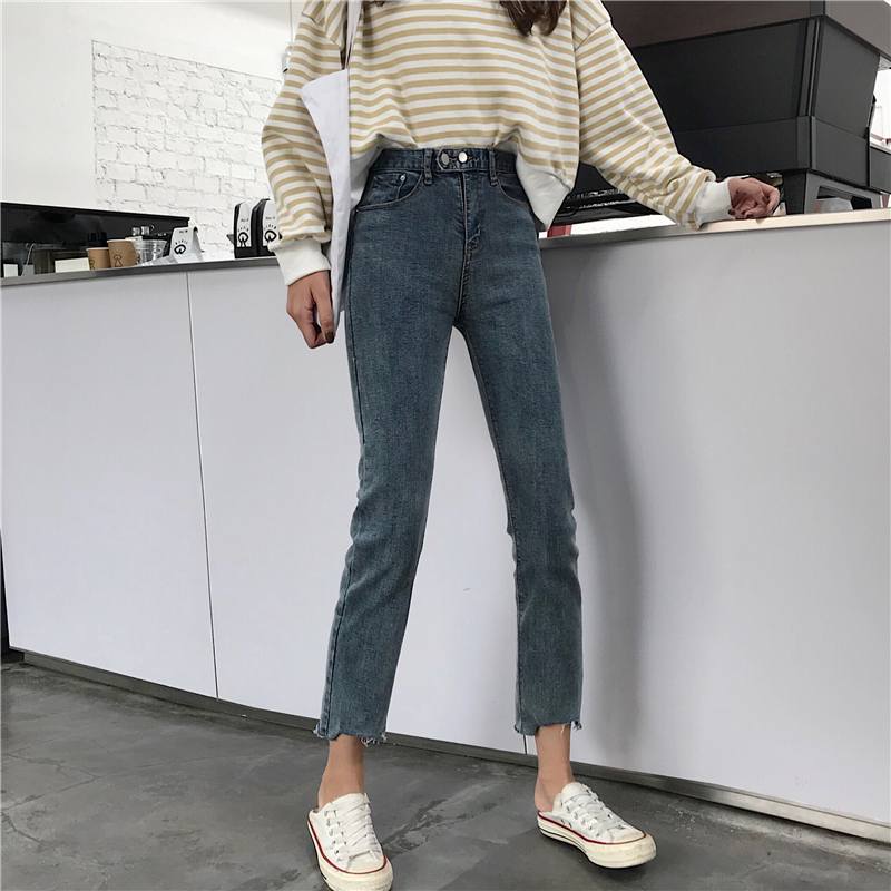 / 秋季女裝韓版不規則褲腳兩粒扣牛仔褲高腰顯瘦直筒褲九分褲闊腿褲