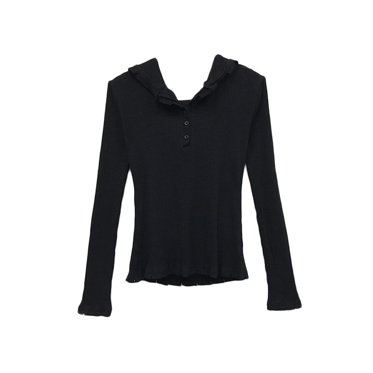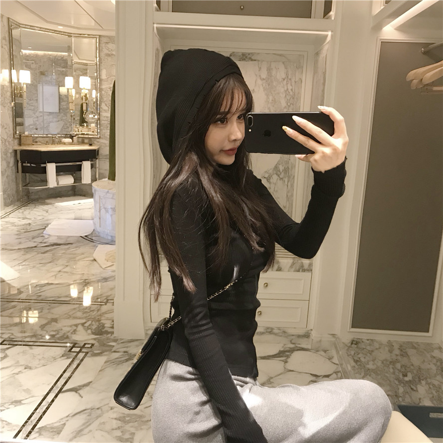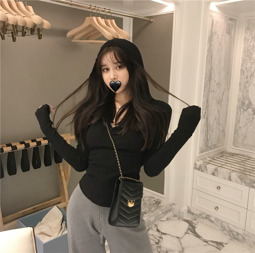 / 初秋新款女上衣抖音同款網紅套頭連帽打底針織緊身顯瘦黑色毛衣女