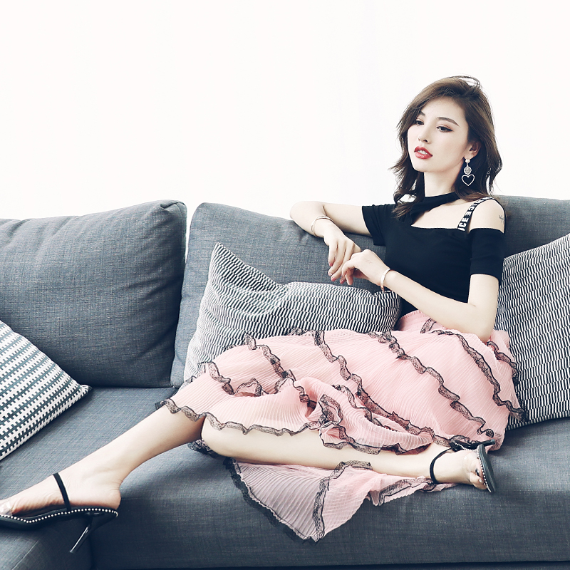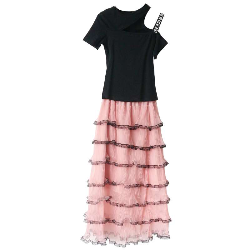 S秀時尚網紅女裝2018夏季新品吊帶露肩上衣層層蛋糕網紗半裙套裝
