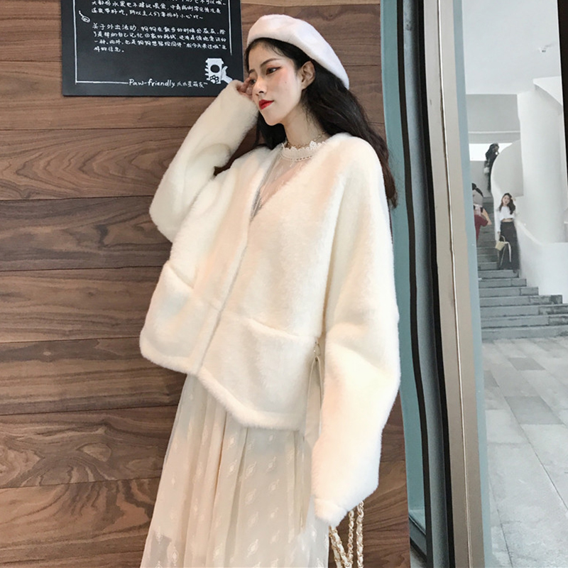 不規則短款毛絨外套女秋冬裝2018新款韓版寬松休閑V領長袖開衫潮