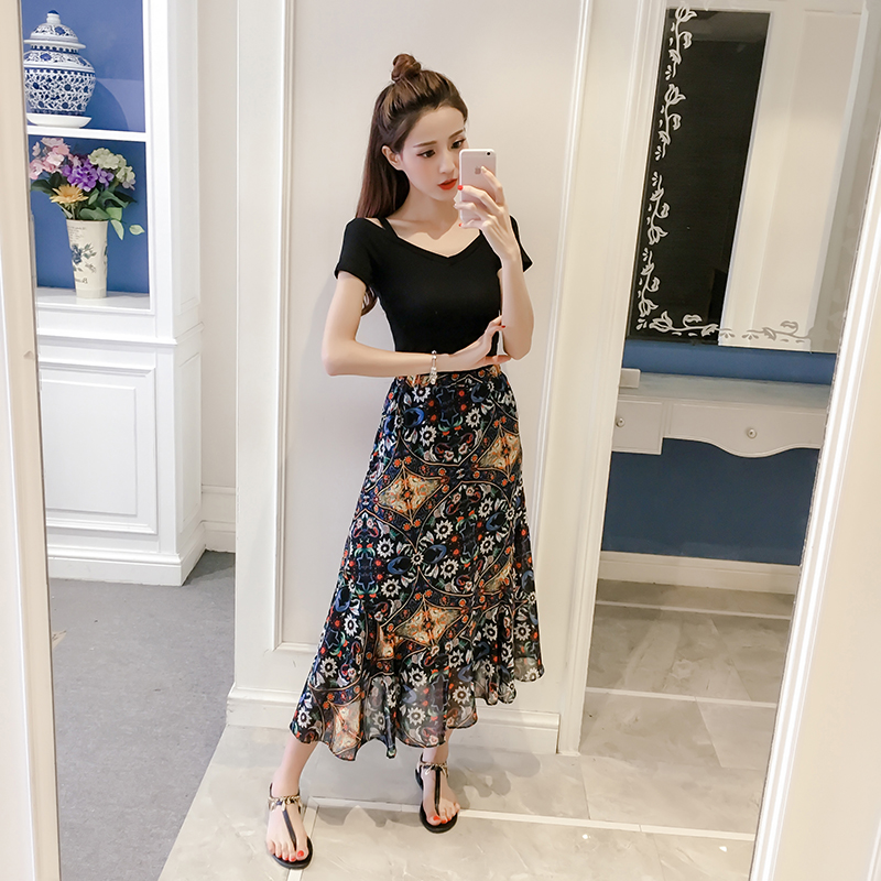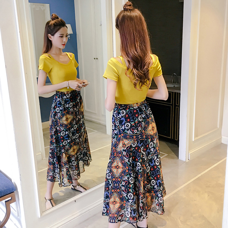 / 夏裝新款韓版露肩修身吊帶上衣雪紡碎花長款半身裙兩件套裝女